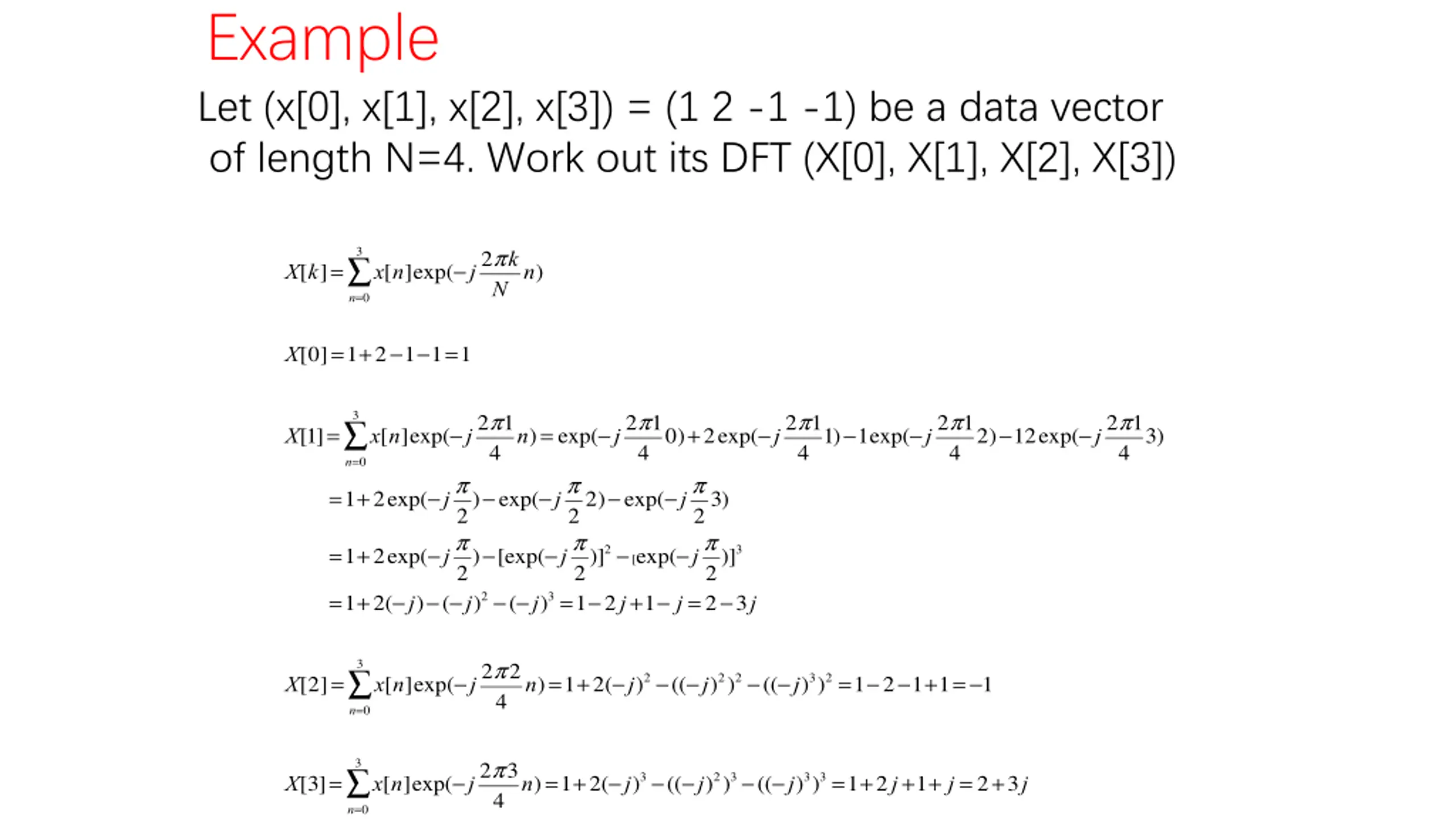 Example Let (x[0], x[1], x[2], x[3]) = (1 2 -1 -1) be a data vector of length N=4. Work out its DFT (X[0], X[1], X[2], X[3]) 3 2pk N X[k]= x[n]exp(-j n) n=0 X[0]=1+2-1-1=1 3 2p1 4 n)= exp(-j2p1 0)+2exp(-j2p1 1)-1exp(-j2p1 2)-12exp(-j2p1 X[1]= x[n]exp(-j 3) 4 4 4 4 n=0 =1+2exp(-jp 2)-exp(-jp 2)-[exp(-jp 22)-exp(-jp 2)]2- [exp(-jp 23) =1+2exp(-jp 2)]3 =1+2(-j)-(-j)2-(-j)3=1-2j+1- j = 2-3j 3 2p2 4 X[2]= x[n]exp(-j n)=1+2(-j)2-((-j)2)2-((-j)3)2=1-2-1+1=-1 n=0 3 2p3 4 X[3]= x[n]exp(-j n)=1+2(-j)3-((-j)2)3-((-j)3)3=1+2j+1+ j = 2+3j n=0