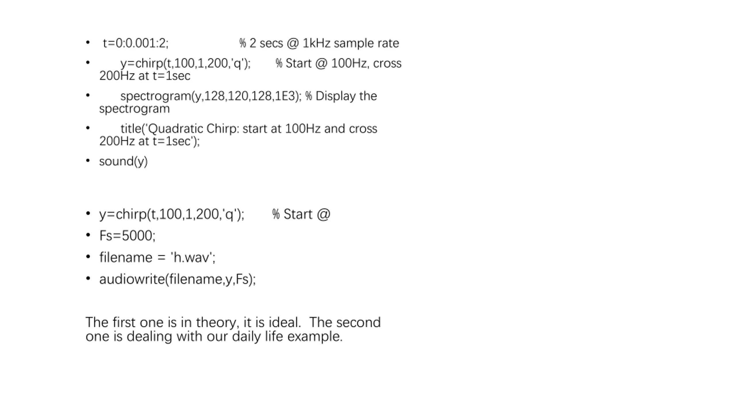 t=0:0.001:2; % 2 secs @ 1kHz sample rate y=chirp(t,100,1,200,'q'); % Start @ 100Hz, cross 200Hz at t=1sec spectrogram(y,128,120,128,1E3); % Display the spectrogram title('Quadratic Chirp: start at 100Hz and cross 200Hz at t=1sec'); sound(y) y=chirp(t,100,1,200,'q'); % Start @ Fs=5000; filename = 'h.wav'; audiowrite(filename,y,Fs); The first one is in theory, it is ideal. The second one is dealing with our daily life example.