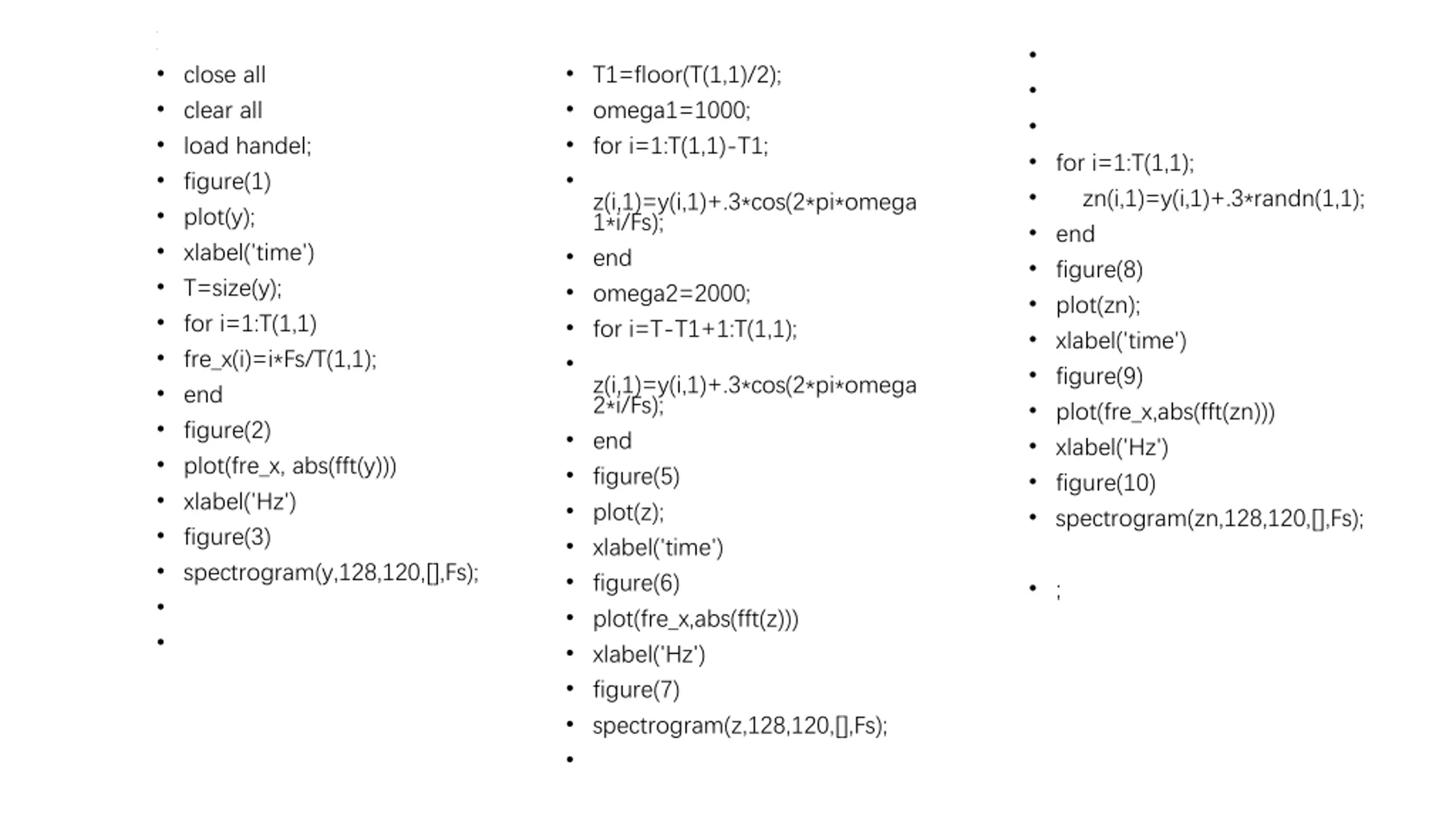 for i=1:T(1,1); zn(i,1)=y(i,1)+.3*randn(1,1); end figure(8) plot(zn); xlabel('time') figure(9) plot(fre_x,abs(fft(zn))) xlabel('Hz') figure(10) spectrogram(zn,128,120,[],Fs); close all clear all load handel; figure(1) plot(y); xlabel('time') T=size(y); for i=1:T(1,1) fre_x(i)=i*Fs/T(1,1); end figure(2) plot(fre_x, abs(fft(y))) xlabel('Hz') figure(3) spectrogram(y,128,120,[],Fs); T1=floor(T(1,1)/2); omega1=1000; for i=1:T(1,1)-T1; z(i,1)=y(i,1)+.3*cos(2*pi*omega 1*i/Fs); end omega2=2000; for i=T-T1+1:T(1,1); z(i,1)=y(i,1)+.3*cos(2*pi*omega 2*i/Fs); end figure(5) plot(z); xlabel('time') figure(6) plot(fre_x,abs(fft(z))) xlabel('Hz') figure(7) spectrogram(z,128,120,[],Fs); ;