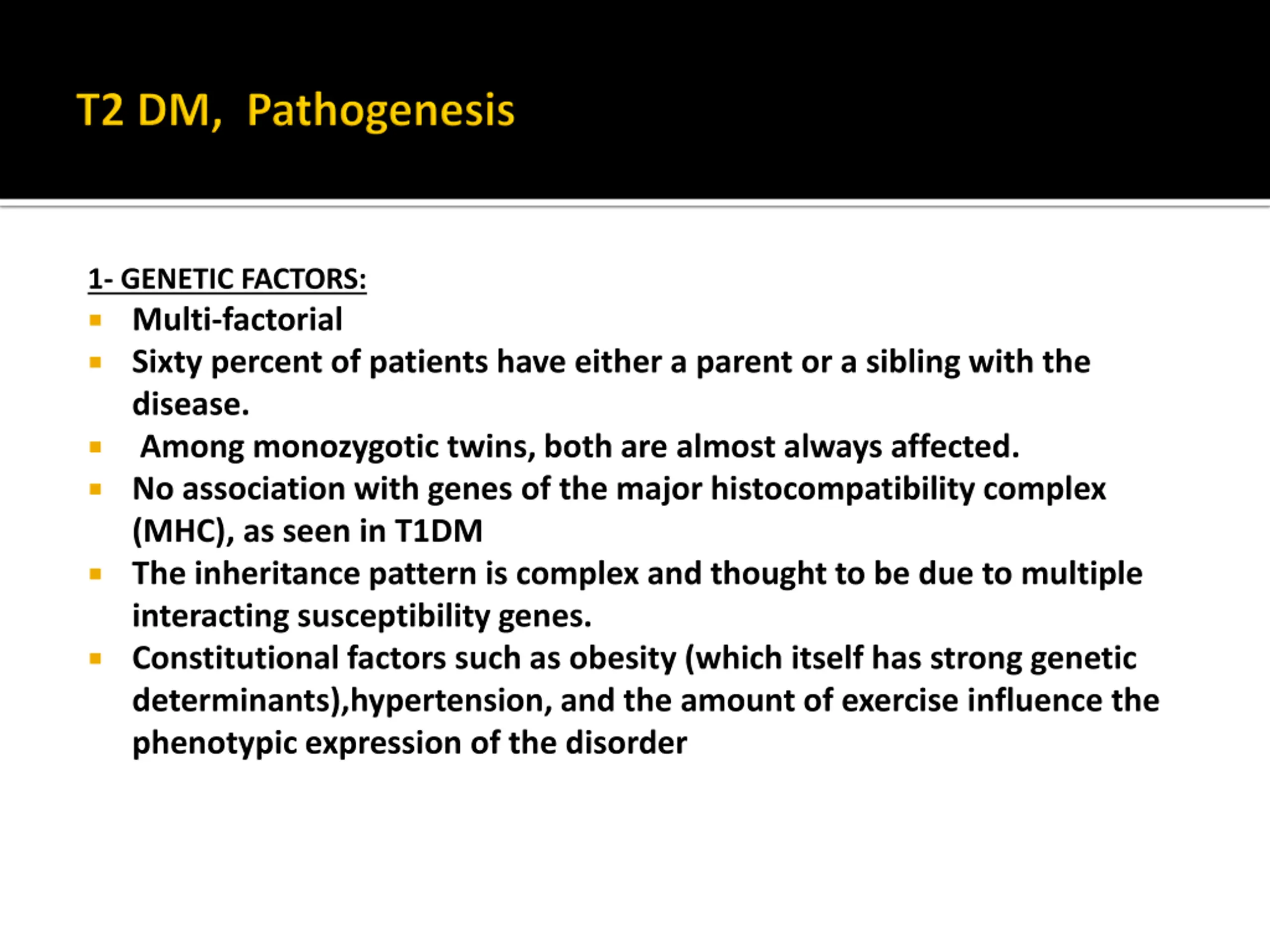 1- GENETIC FACTORS: Multi-factorial Sixty percent of patients have either a parent or a sibling with the disease. Among monozygotic twins, both are almost always affected. No association with genes of the major histocompatibility complex (MHC), as seen in T1DM The inheritance pattern is complex and thought to be due to multiple interacting susceptibility genes. Constitutional factors such as obesity (which itself has strong genetic determinants),hypertension, and the amount of exercise influence the phenotypic expression of the disorder