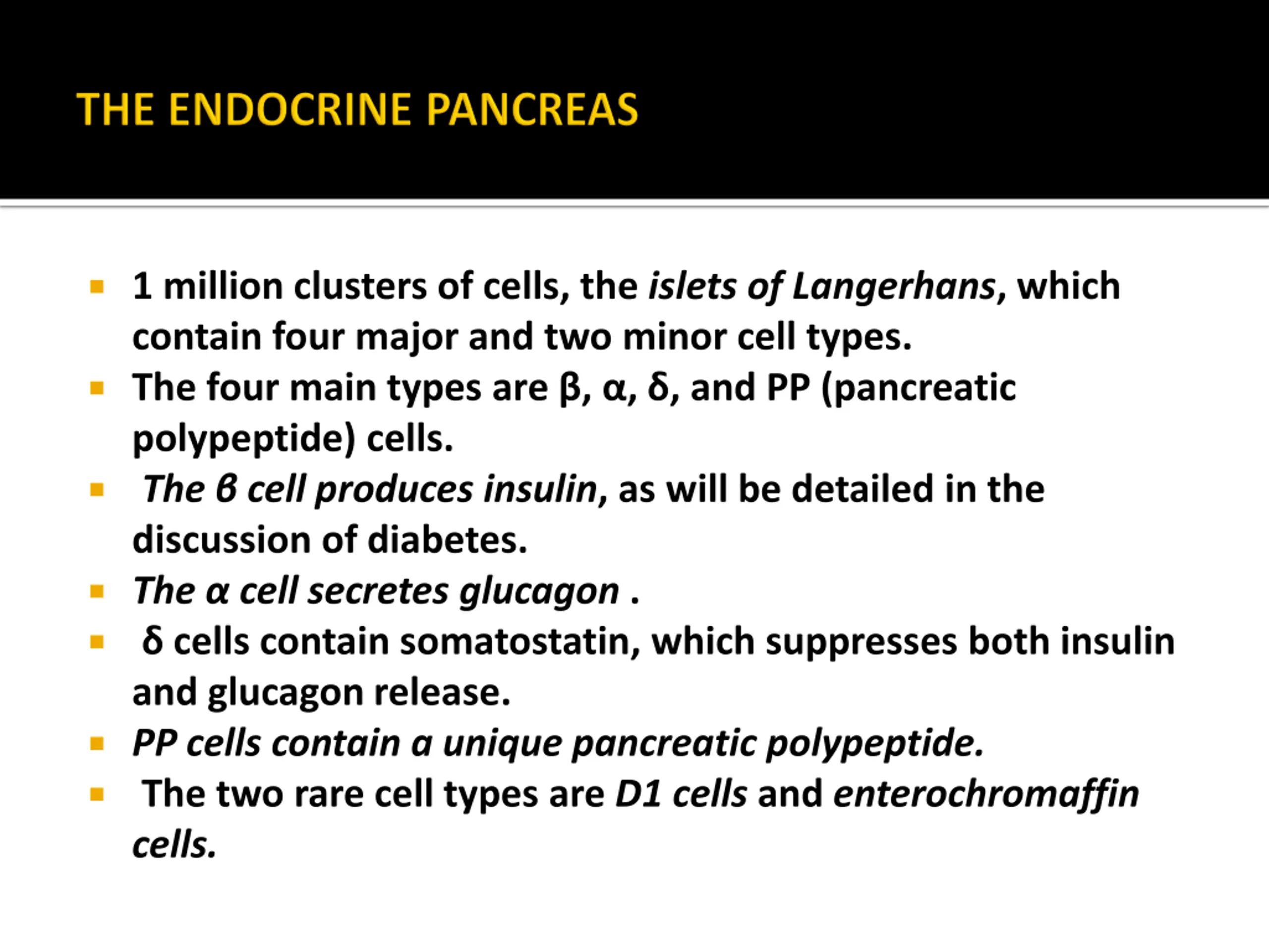 1 million clusters of cells, the islets of Langerhans, which contain four major and two minor cell types. The four main types are , , , and PP (pancreatic polypeptide) cells. The cell produces insulin, as will be detailed in the discussion of diabetes. The cell secretes glucagon . cells contain somatostatin, which suppresses both insulin and glucagon release. PP cells contain a unique pancreatic polypeptide. The two rare cell types are D1 cells and enterochromaffin cells.
