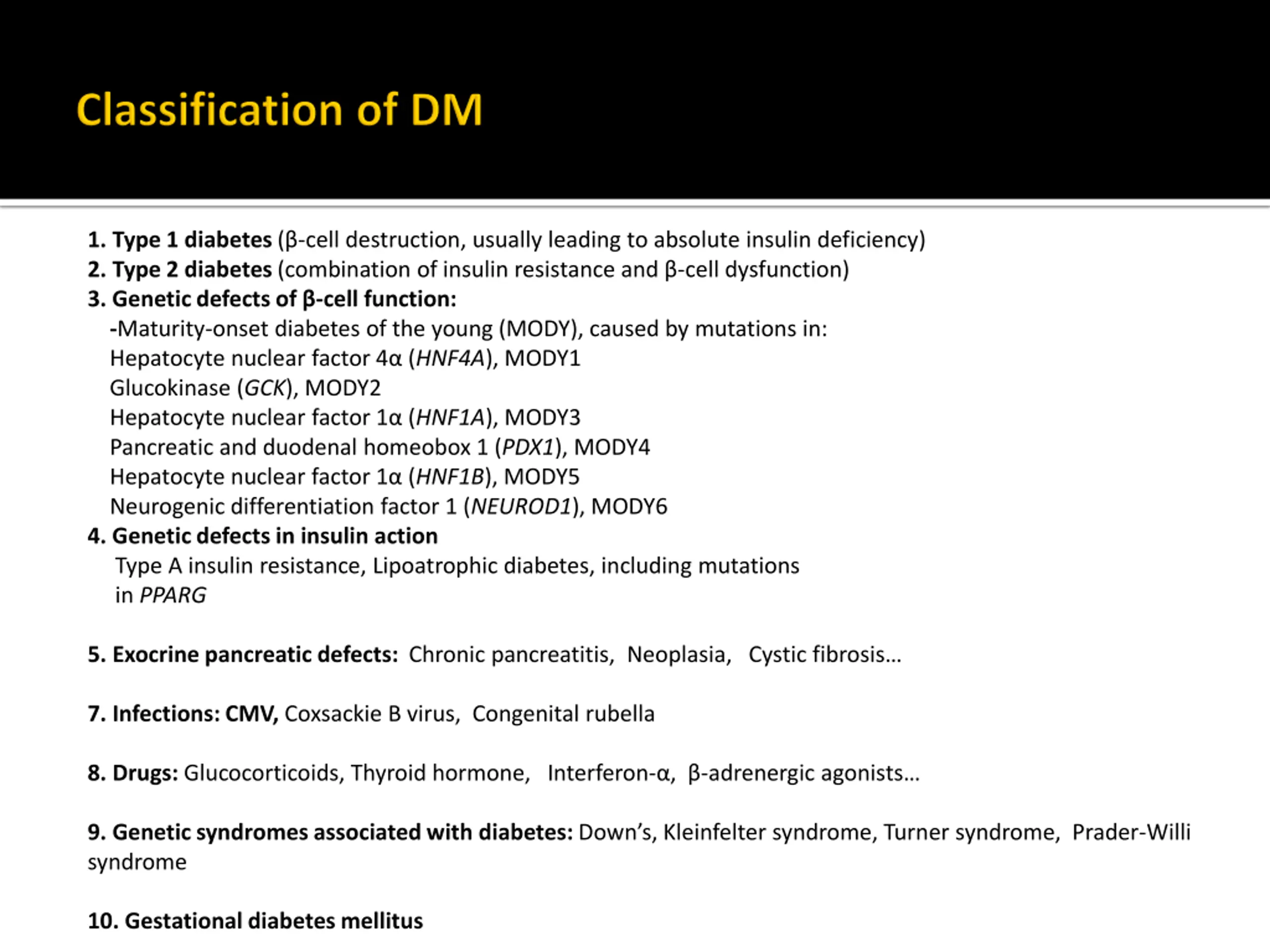 1. Type 1 diabetes (-cell destruction, usually leading to absolute insulin deficiency) 2. Type 2 diabetes (combination of insulin resistance and -cell dysfunction) 3. Genetic defects of -cell function: -Maturity-onset diabetes of the young (MODY), caused by mutations in: Hepatocyte nuclear factor 4 (HNF4A), MODY1 Glucokinase (GCK), MODY2 Hepatocyte nuclear factor 1 (HNF1A), MODY3 Pancreatic and duodenal homeobox 1 (PDX1), MODY4 Hepatocyte nuclear factor 1 (HNF1B), MODY5 Neurogenic differentiation factor 1 (NEUROD1), MODY6 4. Genetic defects in insulin action Type A insulin resistance, Lipoatrophic diabetes, including mutations in PPARG 5. Exocrine pancreatic defects: Chronic pancreatitis, Neoplasia, Cystic fibrosis 7. Infections: CMV, Coxsackie B virus, Congenital rubella 8. Drugs: Glucocorticoids, Thyroid hormone, Interferon- , -adrenergic agonists 9. Genetic syndromes associated with diabetes: Down s, Kleinfelter syndrome, Turner syndrome, Prader-Willi syndrome 10. Gestational diabetes mellitus