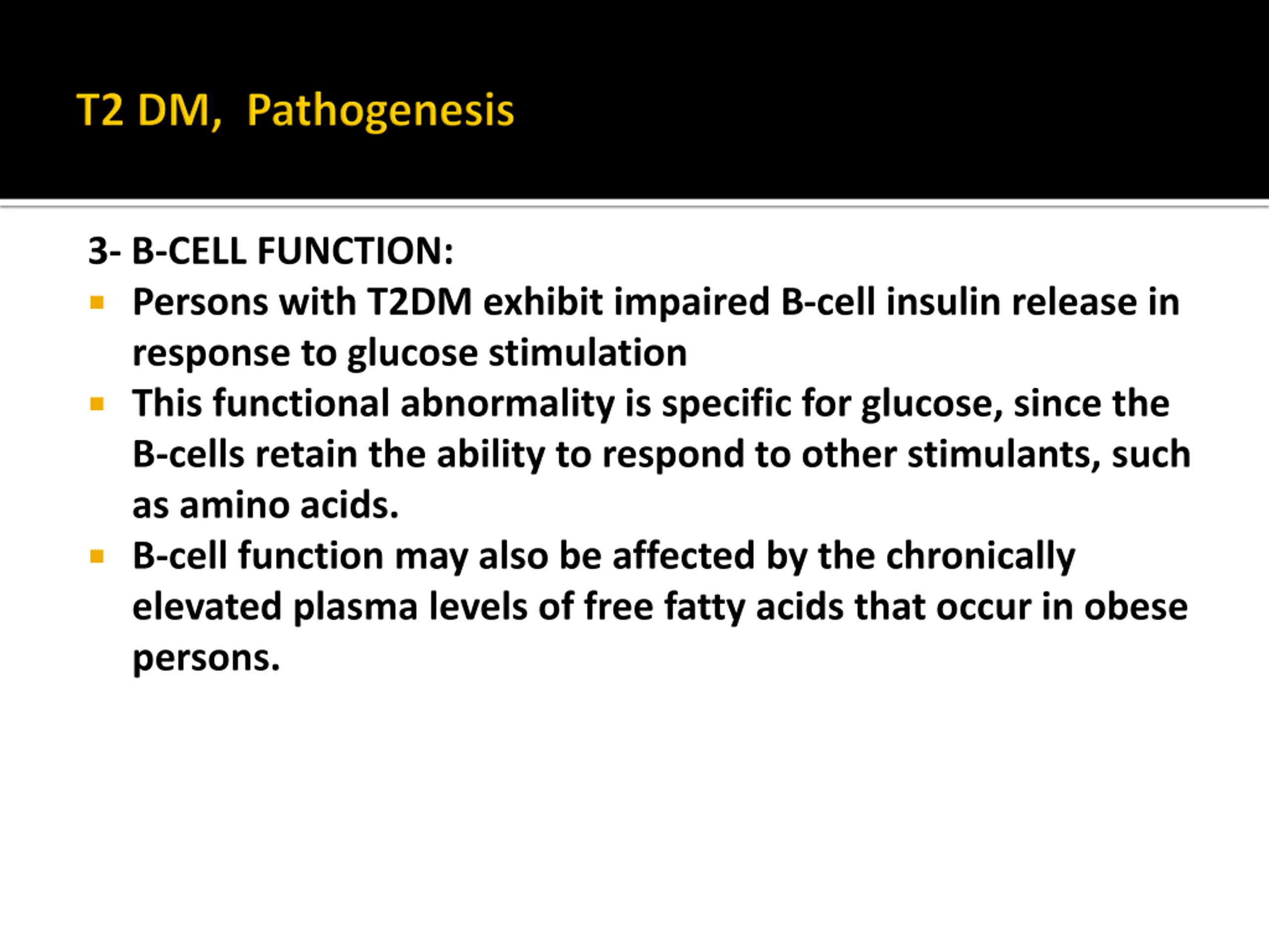 3- B-CELL FUNCTION: Persons with T2DM exhibit impaired B-cell insulin release in response to glucose stimulation This functional abnormality is specific for glucose, since the B-cells retain the ability to respond to other stimulants, such as amino acids. B-cell function may also be affected by the chronically elevated plasma levels of free fatty acids that occur in obese persons.