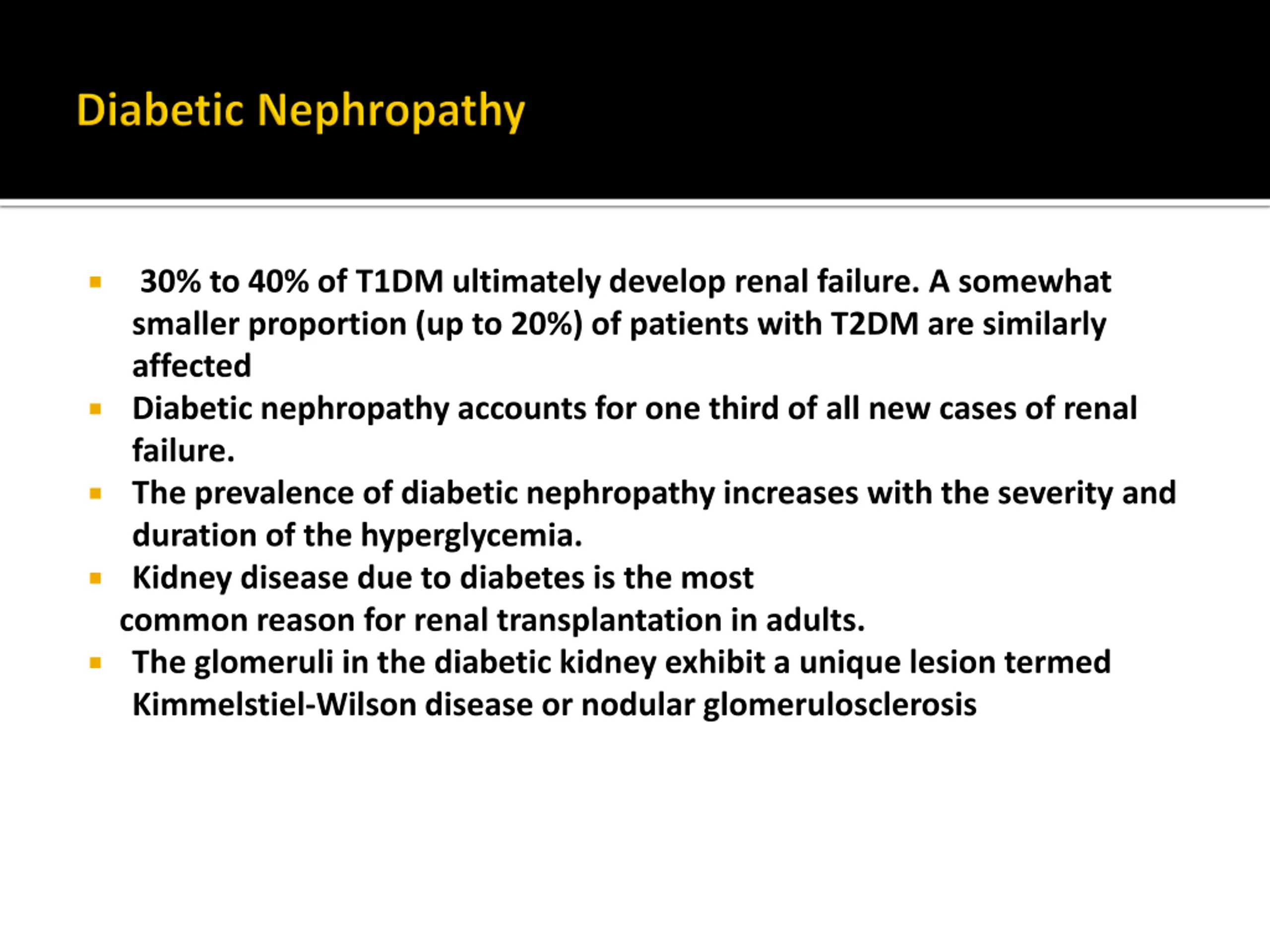 30% to 40% of T1DM ultimately develop renal failure. A somewhat smaller proportion (up to 20%) of patients with T2DM are similarly affected Diabetic nephropathy accounts for one third of all new cases of renal failure. The prevalence of diabetic nephropathy increases with the severity and duration of the hyperglycemia. Kidney disease due to diabetes is the most common reason for renal transplantation in adults. The glomeruli in the diabetic kidney exhibit a unique lesion termed Kimmelstiel-Wilson disease or nodular glomerulosclerosis