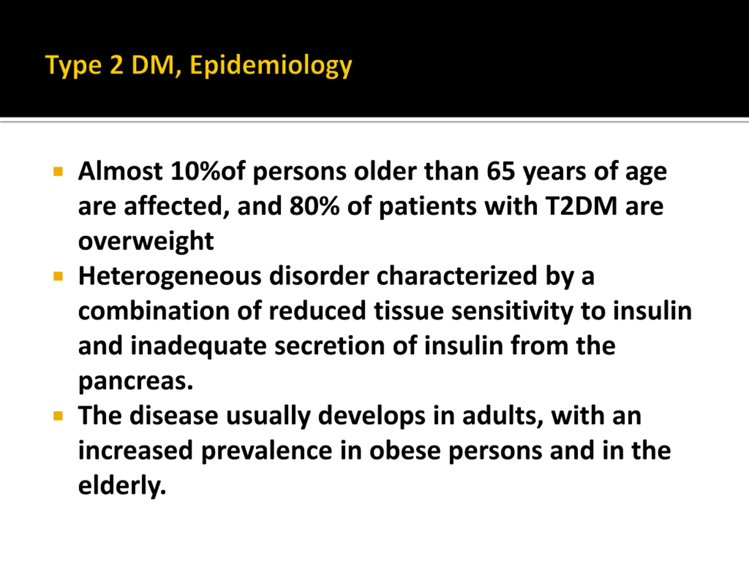 Almost 10%of persons older than 65 years of age are affected, and 80% of patients with T2DM are overweight Heterogeneous disorder characterized by a combination of reduced tissue sensitivity to insulin and inadequate secretion of insulin from the pancreas. The disease usually develops in adults, with an increased prevalence in obese persons and in the elderly.