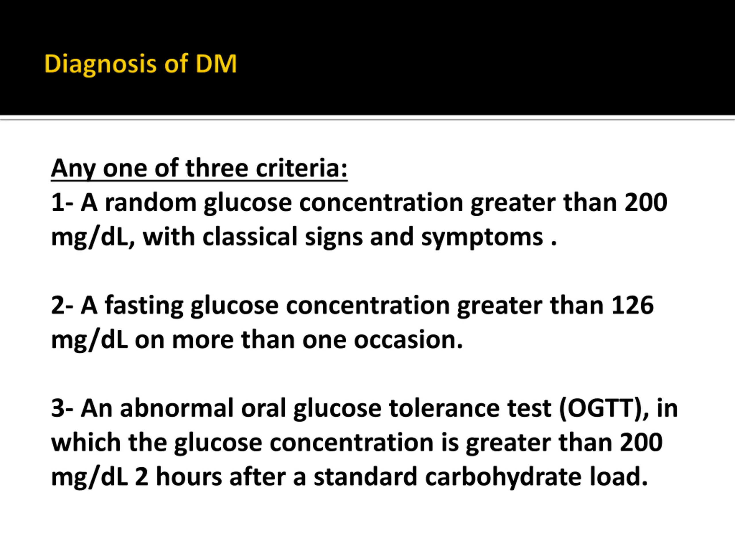 Any one of three criteria: 1- A random glucose concentration greater than 200 mg/dL, with classical signs and symptoms . 2- A fasting glucose concentration greater than 126 mg/dL on more than one occasion. 3- An abnormal oral glucose tolerance test (OGTT), in which the glucose concentration is greater than 200 mg/dL 2 hours after a standard carbohydrate load.