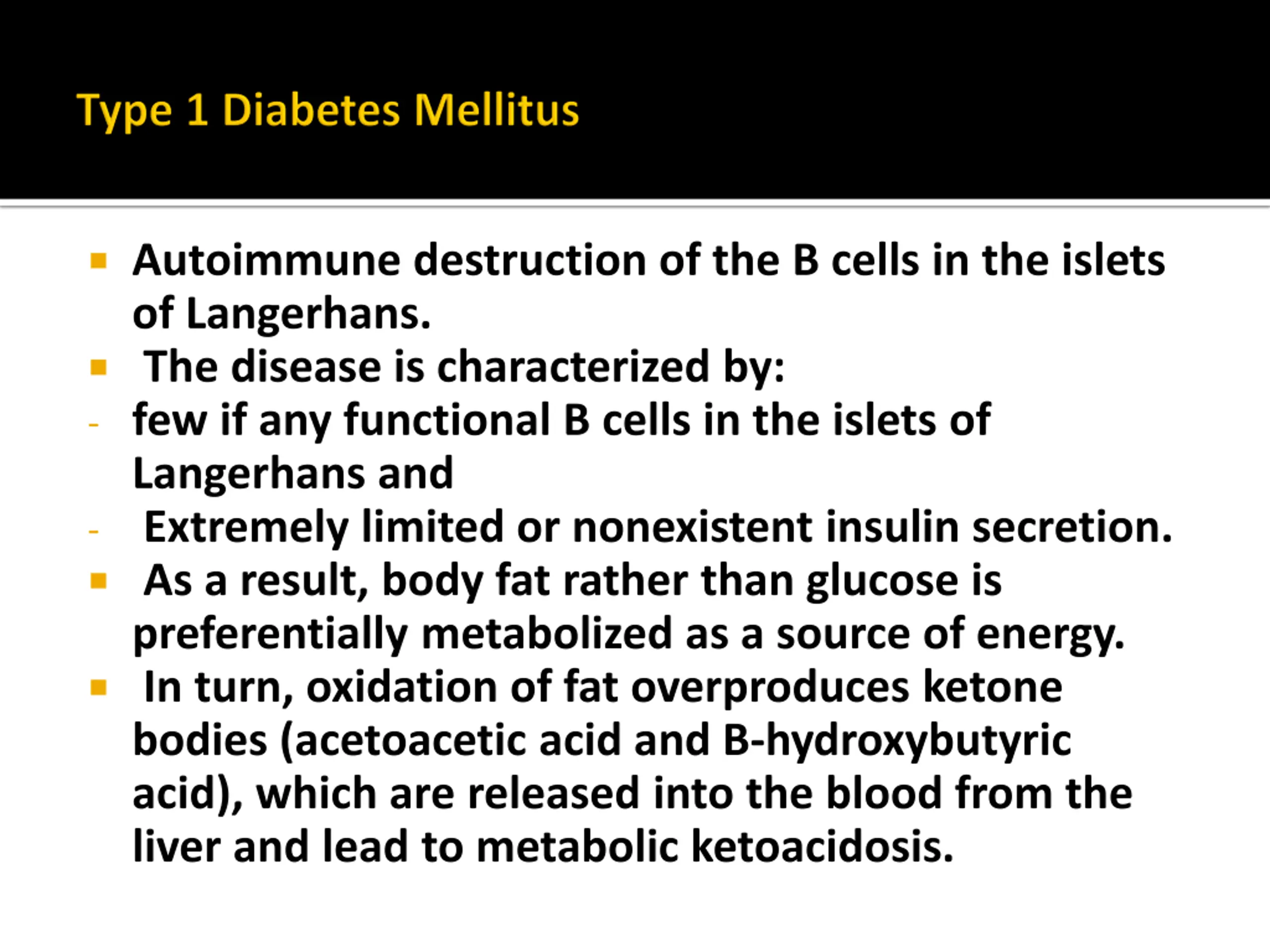 Autoimmune destruction of the B cells in the islets of Langerhans. The disease is characterized by: - few if any functional B cells in the islets of Langerhans and - Extremely limited or nonexistent insulin secretion. As a result, body fat rather than glucose is preferentially metabolized as a source of energy. In turn, oxidation of fat overproduces ketone bodies (acetoacetic acid and B-hydroxybutyric acid), which are released into the blood from the liver and lead to metabolic ketoacidosis.