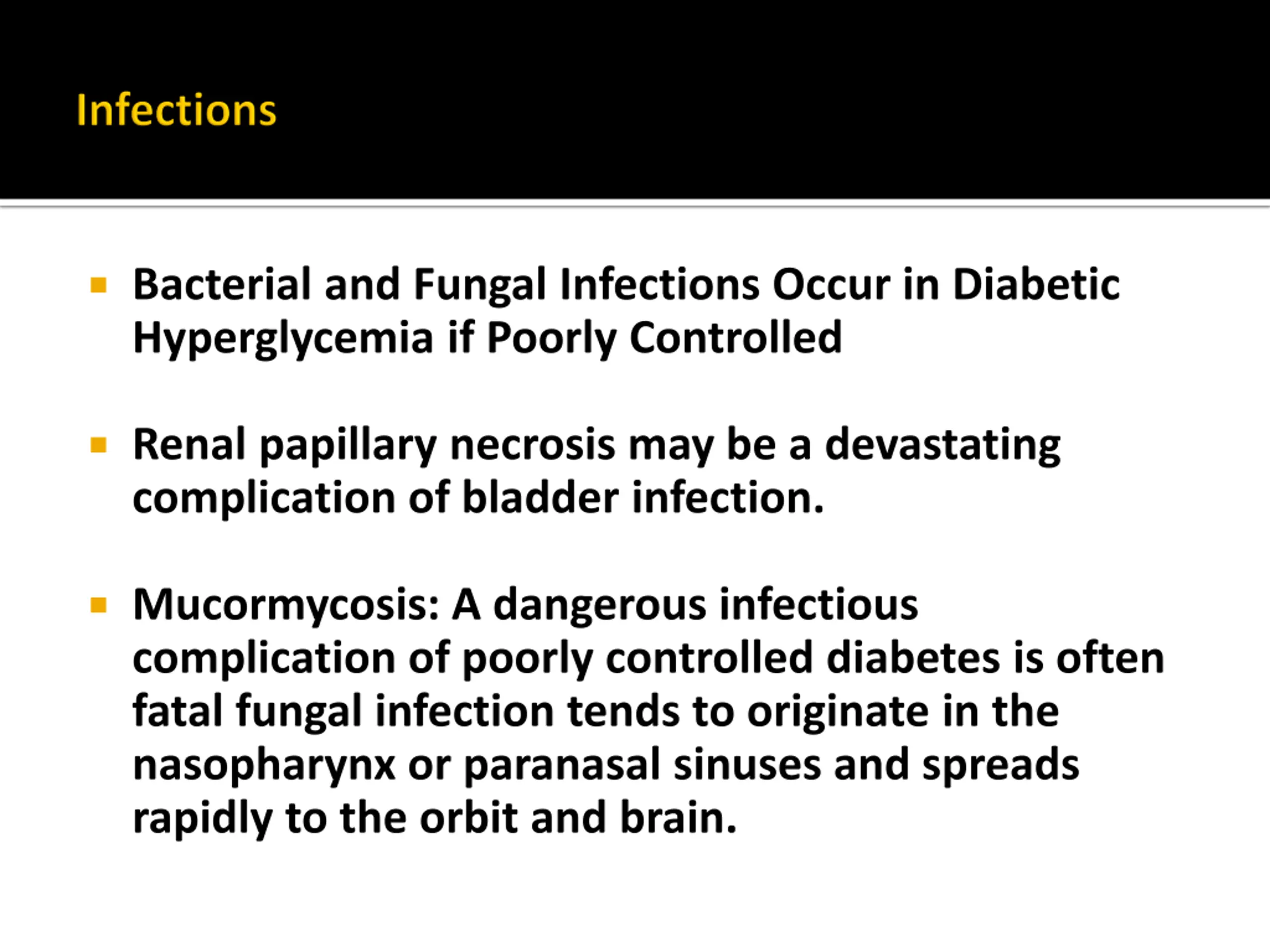 Bacterial and Fungal Infections Occur in Diabetic Hyperglycemia if Poorly Controlled Renal papillary necrosis may be a devastating complication of bladder infection. Mucormycosis: A dangerous infectious complication of poorly controlled diabetes is often fatal fungal infection tends to originate in the nasopharynx or paranasal sinuses and spreads rapidly to the orbit and brain.
