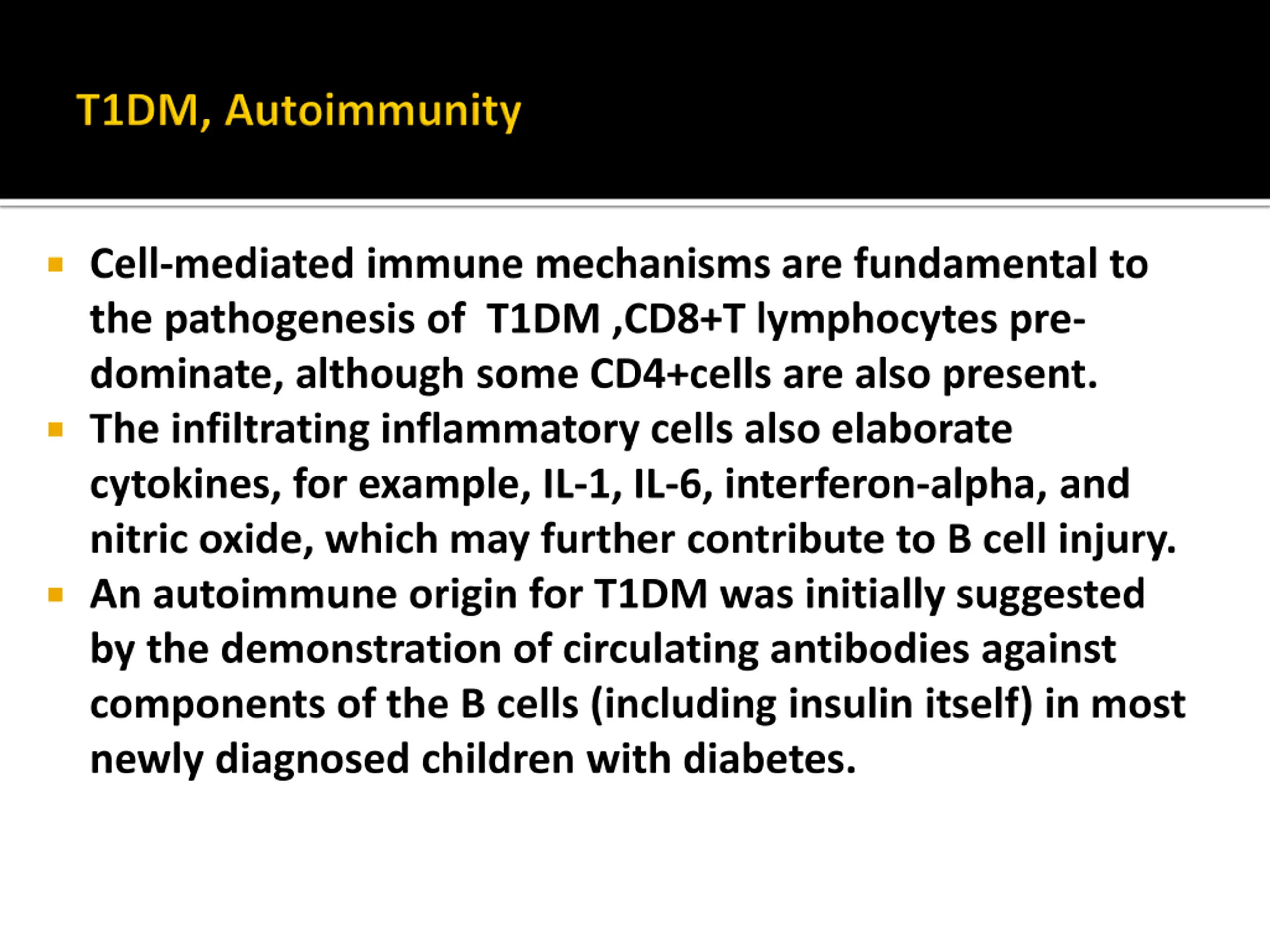 Cell-mediated immune mechanisms are fundamental to the pathogenesis of T1DM ,CD8+T lymphocytes pre- dominate, although some CD4+cells are also present. The infiltrating inflammatory cells also elaborate cytokines, for example, IL-1, IL-6, interferon-alpha, and nitric oxide, which may further contribute to B cell injury. An autoimmune origin for T1DM was initially suggested by the demonstration of circulating antibodies against components of the B cells (including insulin itself) in most newly diagnosed children with diabetes.