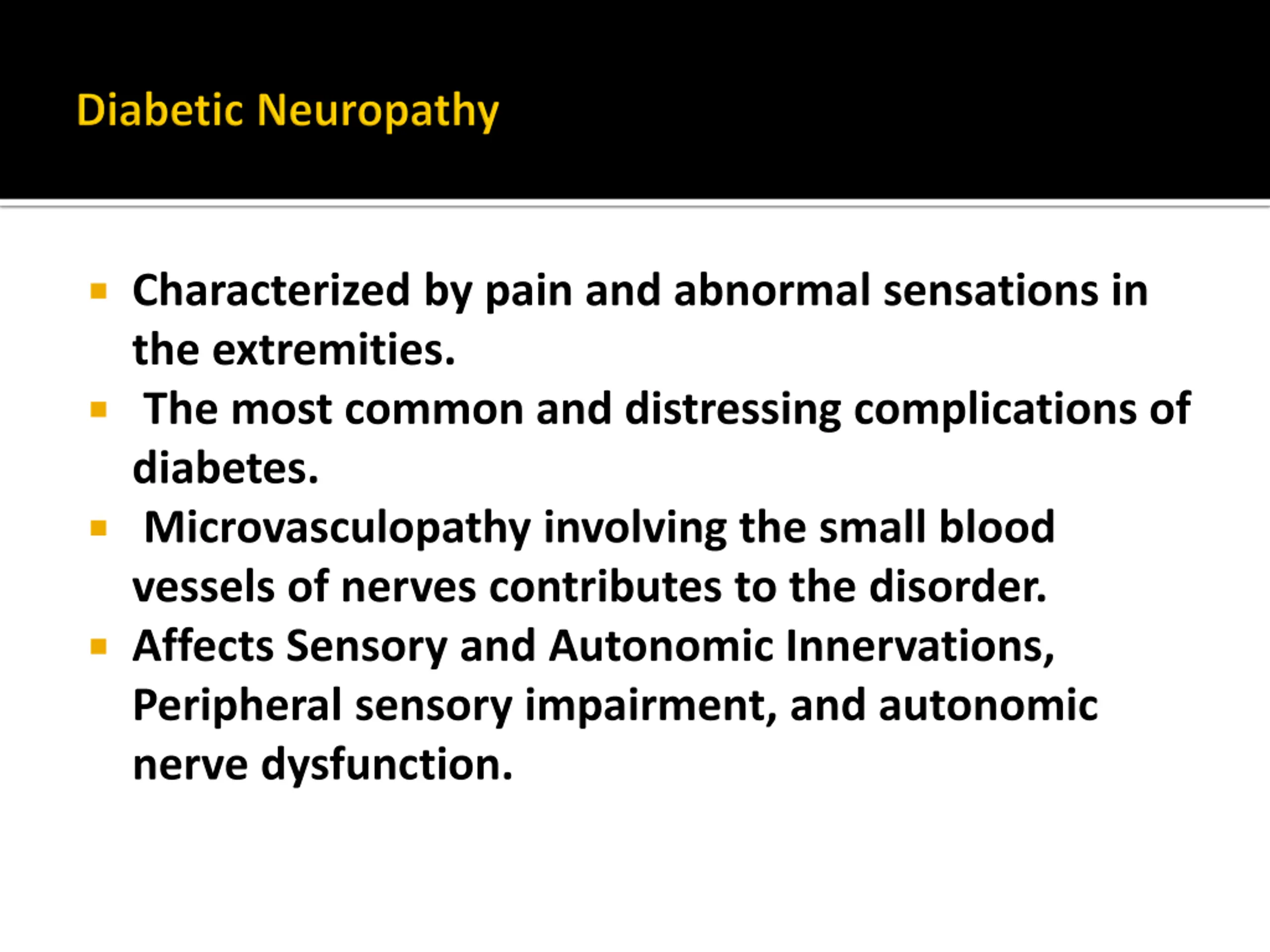 Characterized by pain and abnormal sensations in the extremities. The most common and distressing complications of diabetes. Microvasculopathy involving the small blood vessels of nerves contributes to the disorder. Affects Sensory and Autonomic Innervations, Peripheral sensory impairment, and autonomic nerve dysfunction.