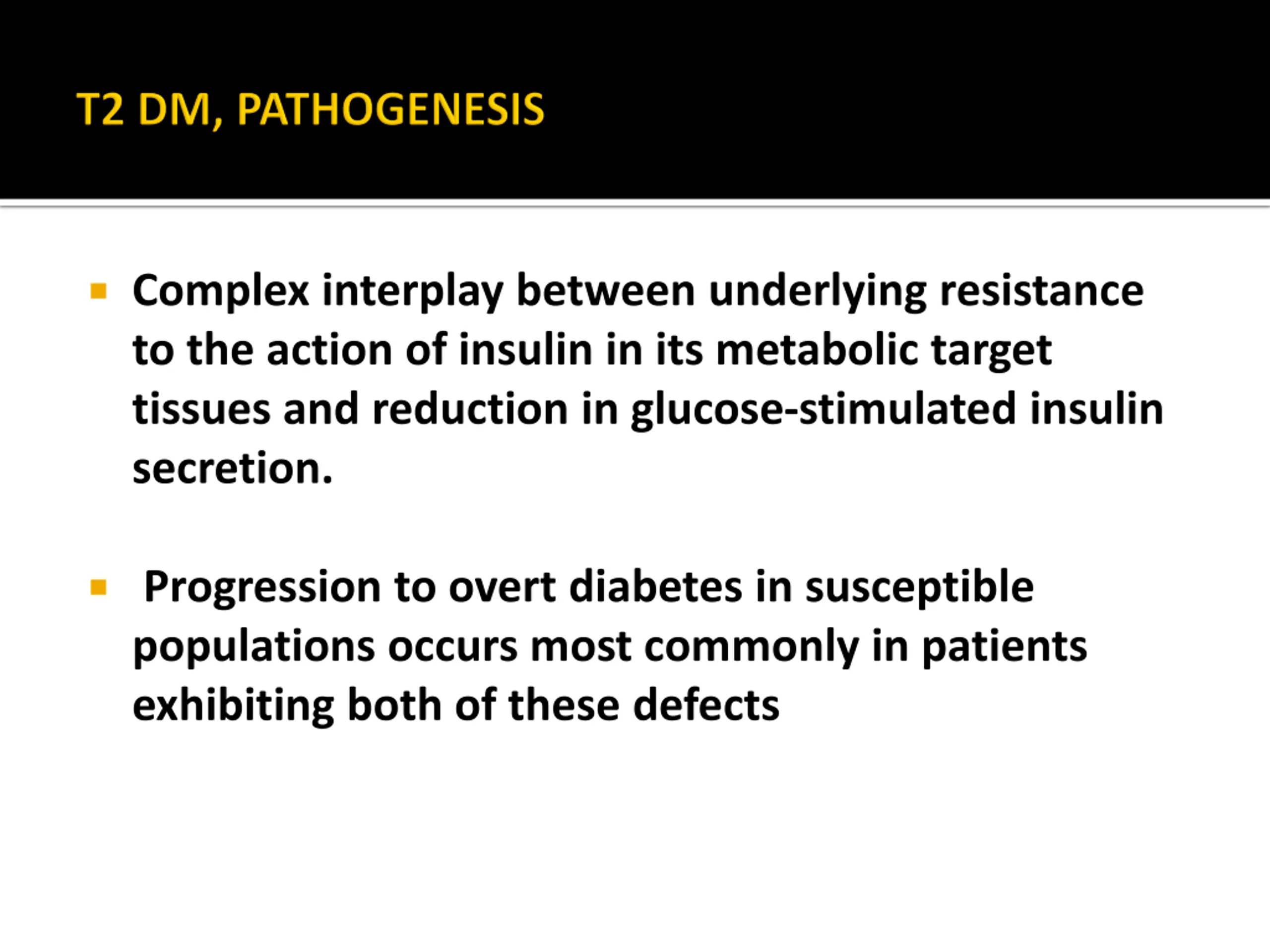 Complex interplay between underlying resistance to the action of insulin in its metabolic target tissues and reduction in glucose-stimulated insulin secretion. Progression to overt diabetes in susceptible populations occurs most commonly in patients exhibiting both of these defects