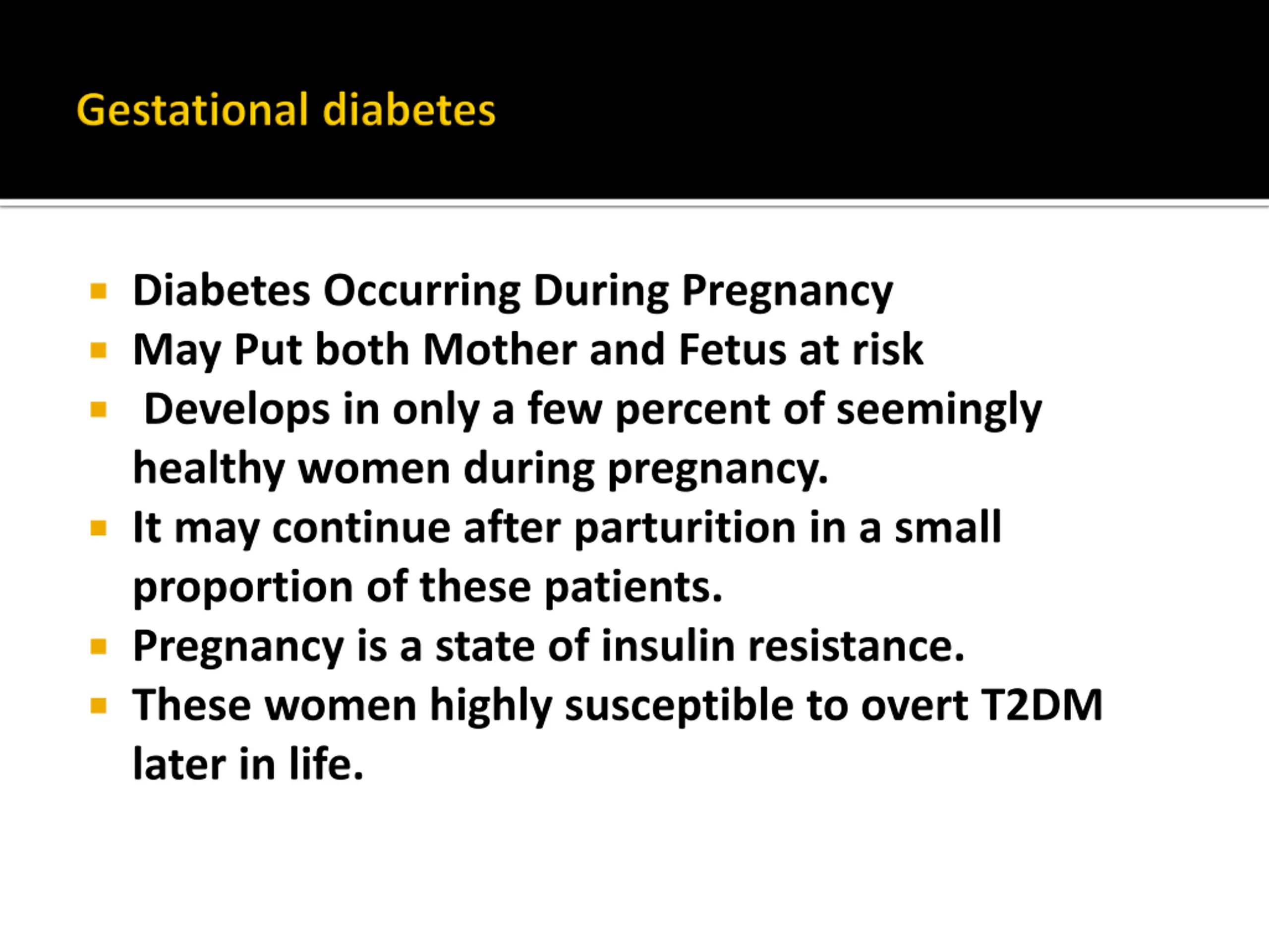 Diabetes Occurring During Pregnancy May Put both Mother and Fetus at risk Develops in only a few percent of seemingly healthy women during pregnancy. It may continue after parturition in a small proportion of these patients. Pregnancy is a state of insulin resistance. These women highly susceptible to overt T2DM later in life.