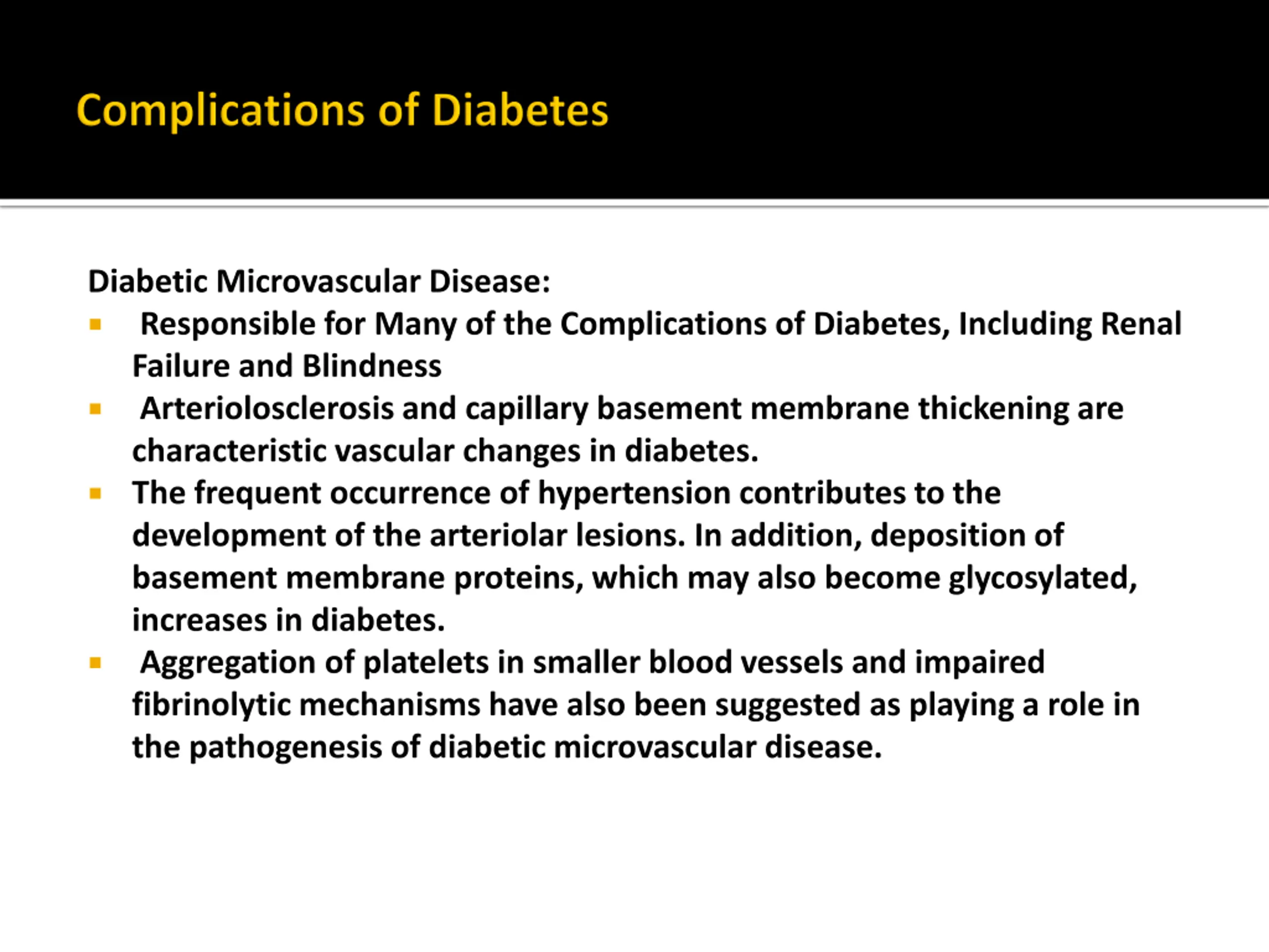 Diabetic Microvascular Disease: Responsible for Many of the Complications of Diabetes, Including Renal Failure and Blindness Arteriolosclerosis and capillary basement membrane thickening are characteristic vascular changes in diabetes. The frequent occurrence of hypertension contributes to the development of the arteriolar lesions. In addition, deposition of basement membrane proteins, which may also become glycosylated, increases in diabetes. Aggregation of platelets in smaller blood vessels and impaired fibrinolytic mechanisms have also been suggested as playing a role in the pathogenesis of diabetic microvascular disease.
