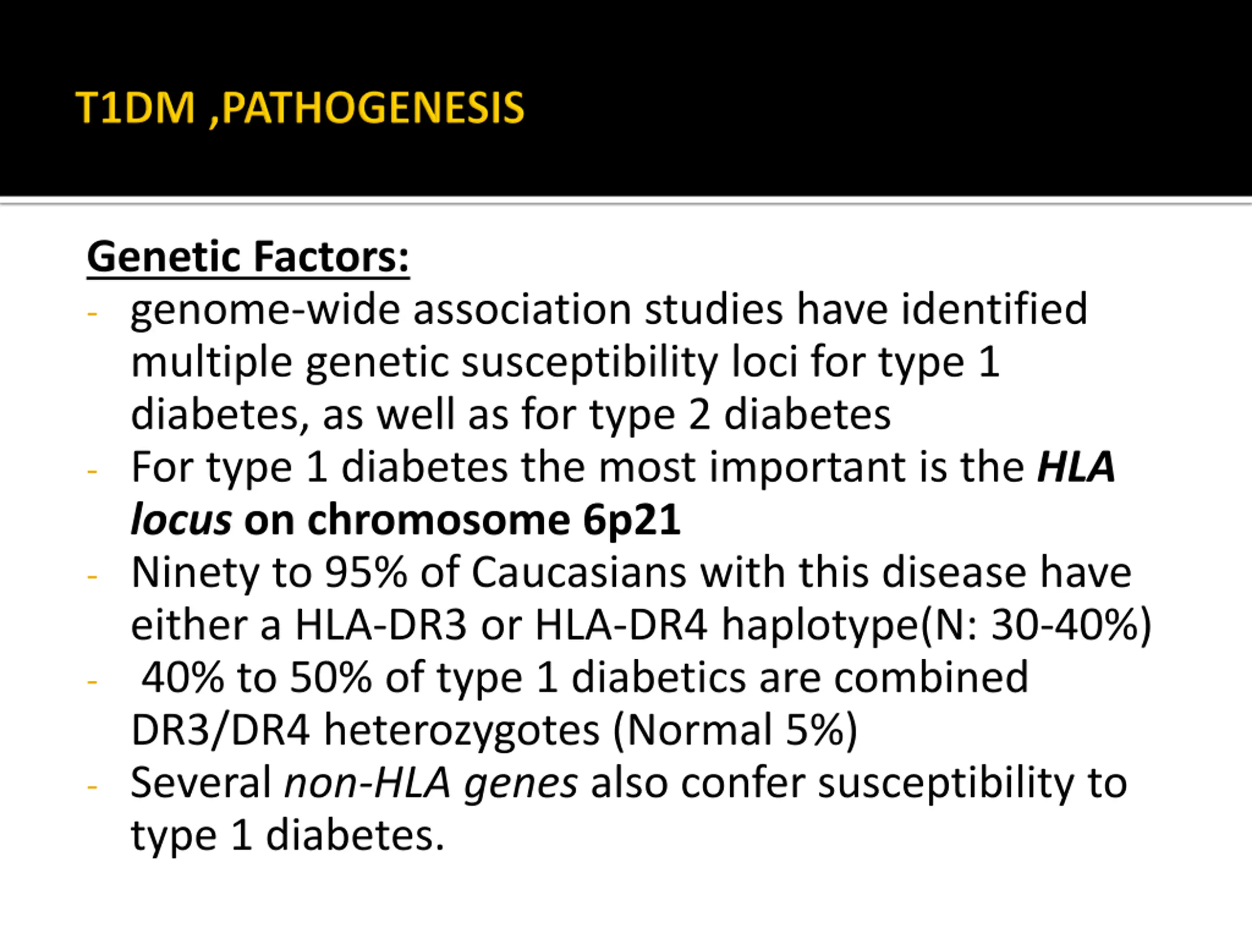 Genetic Factors: - genome-wide association studies have identified multiple genetic susceptibility loci for type 1 diabetes, as well as for type 2 diabetes - For type 1 diabetes the most important is the HLA locus on chromosome 6p21 - Ninety to 95% of Caucasians with this disease have either a HLA-DR3 or HLA-DR4 haplotype(N: 30-40%) - 40% to 50% of type 1 diabetics are combined DR3/DR4 heterozygotes (Normal 5%) - Several non-HLA genes also confer susceptibility to type 1 diabetes.