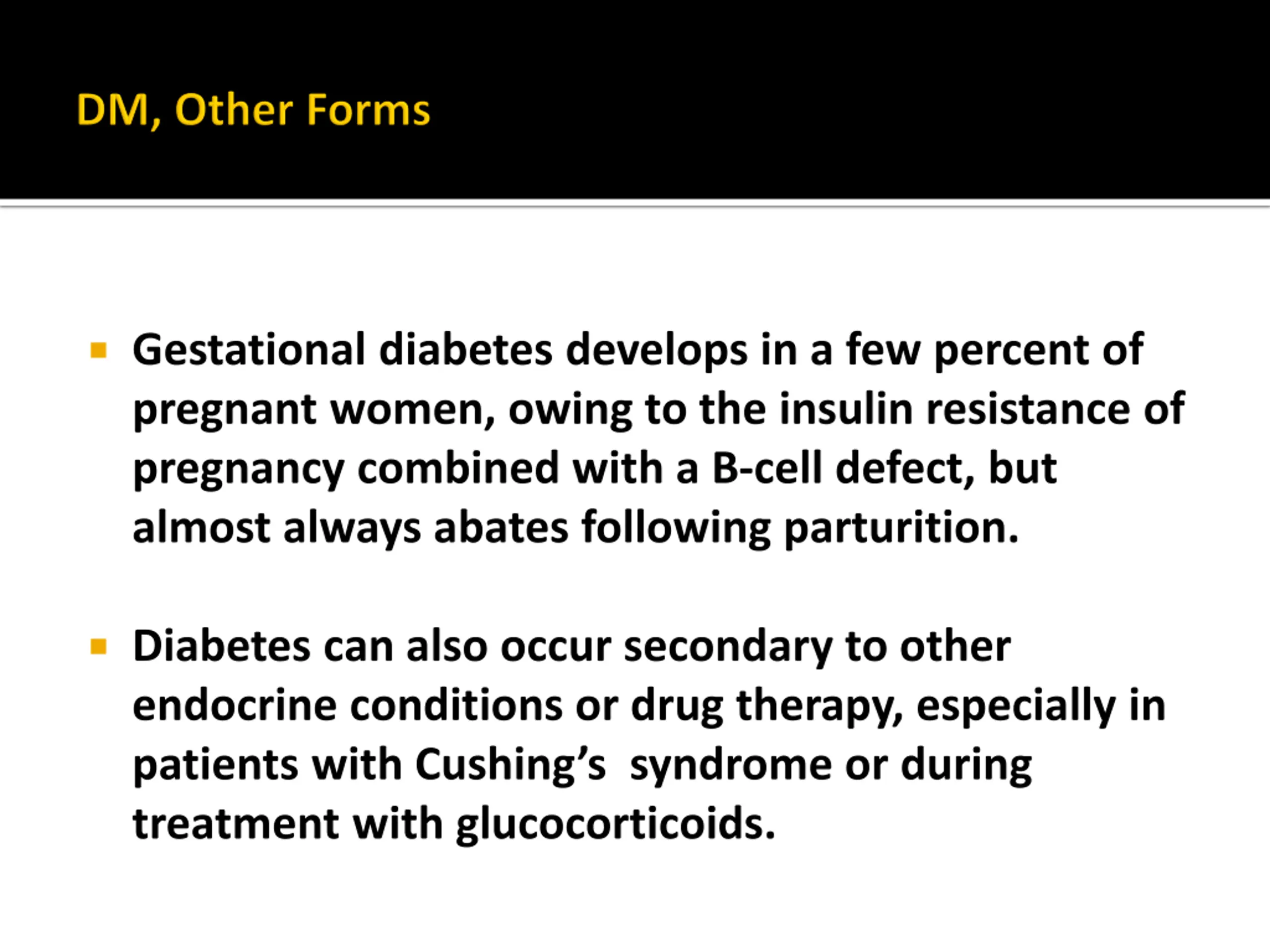 Gestational diabetes develops in a few percent of pregnant women, owing to the insulin resistance of pregnancy combined with a B-cell defect, but almost always abates following parturition. Diabetes can also occur secondary to other endocrine conditions or drug therapy, especially in patients with Cushing s syndrome or during treatment with glucocorticoids.