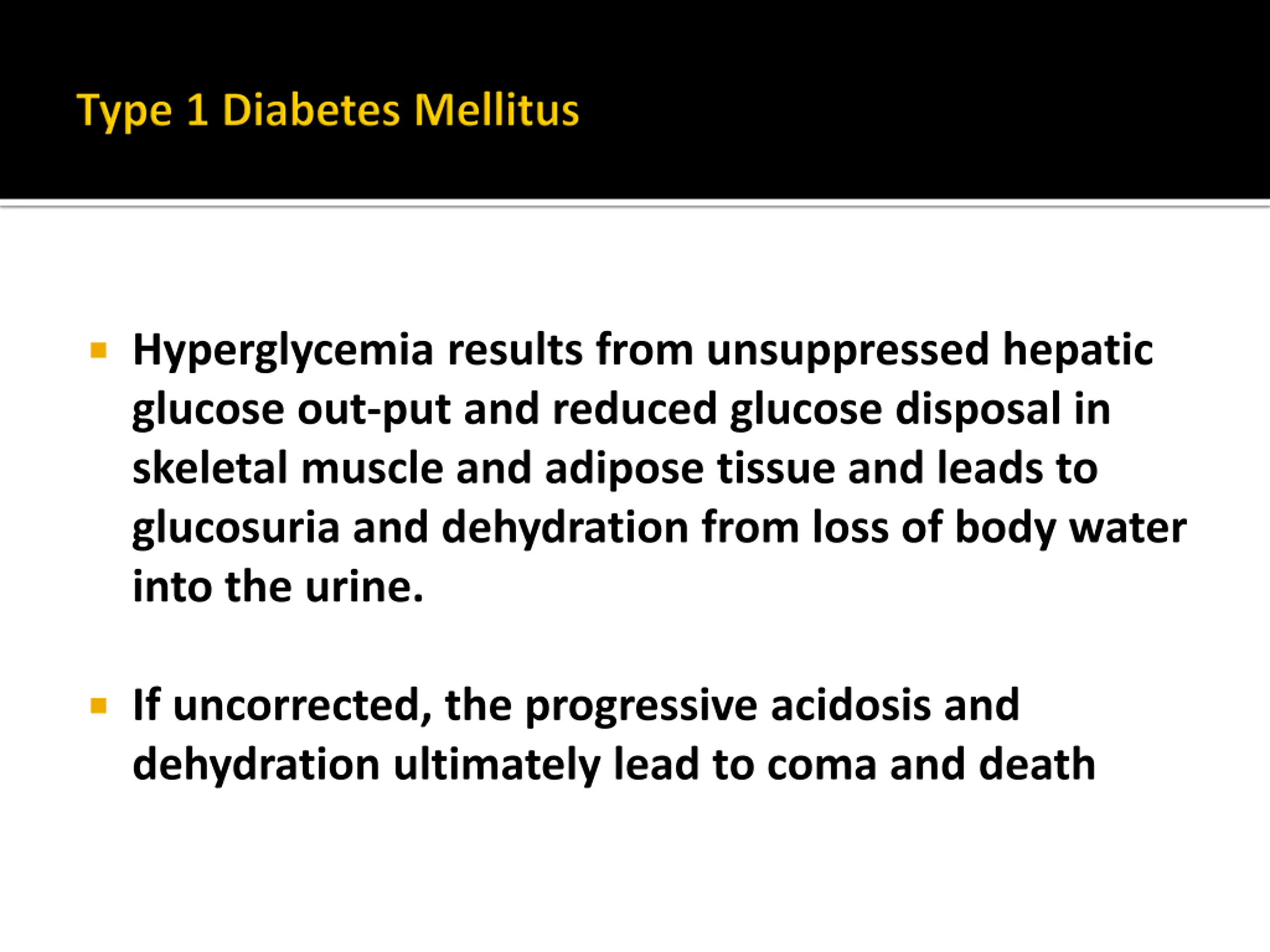 Hyperglycemia results from unsuppressed hepatic glucose out-put and reduced glucose disposal in skeletal muscle and adipose tissue and leads to glucosuria and dehydration from loss of body water into the urine. If uncorrected, the progressive acidosis and dehydration ultimately lead to coma and death