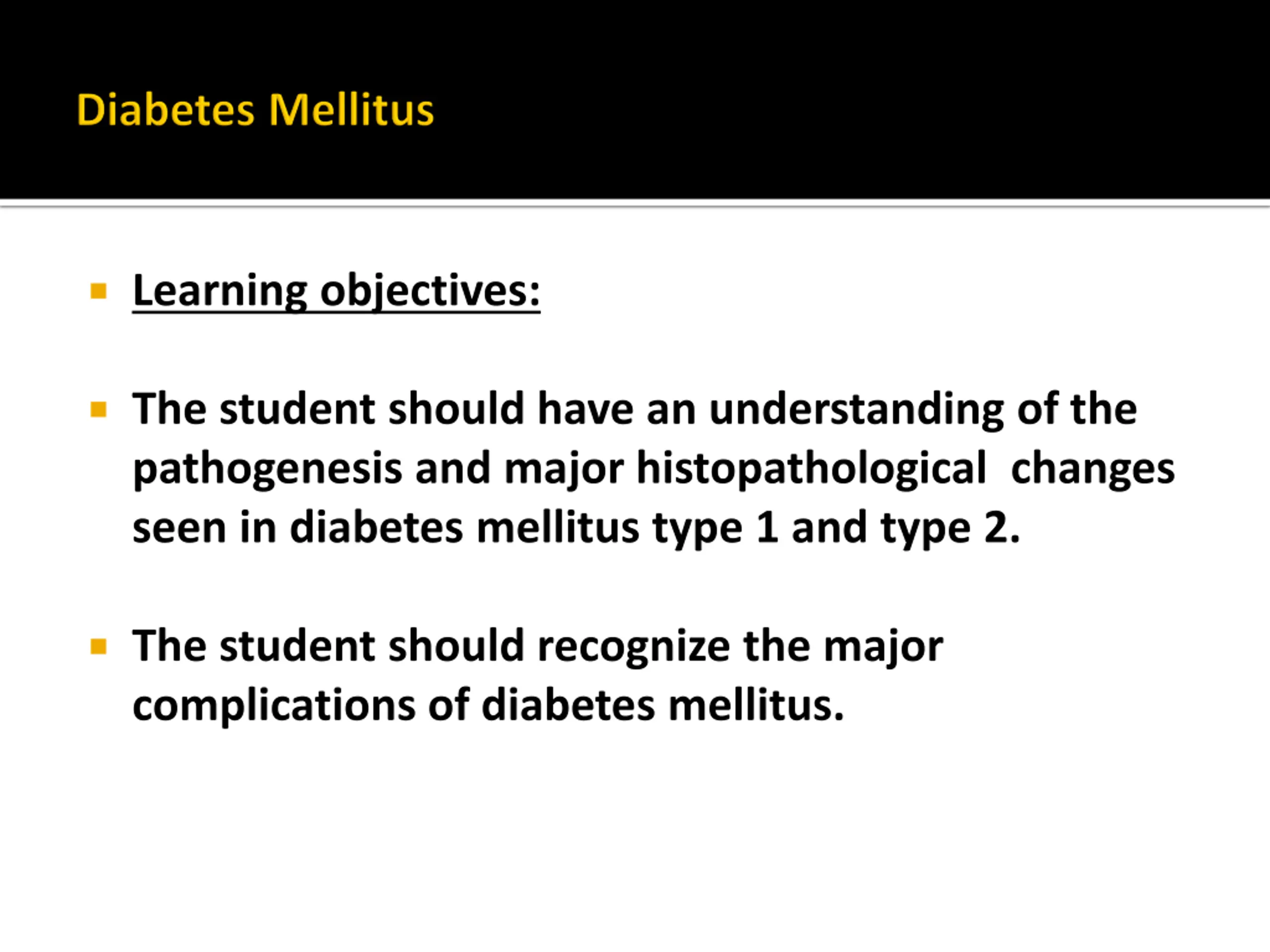 Learning objectives: The student should have an understanding of the pathogenesis and major histopathological changes seen in diabetes mellitus type 1 and type 2. The student should recognize the major complications of diabetes mellitus.