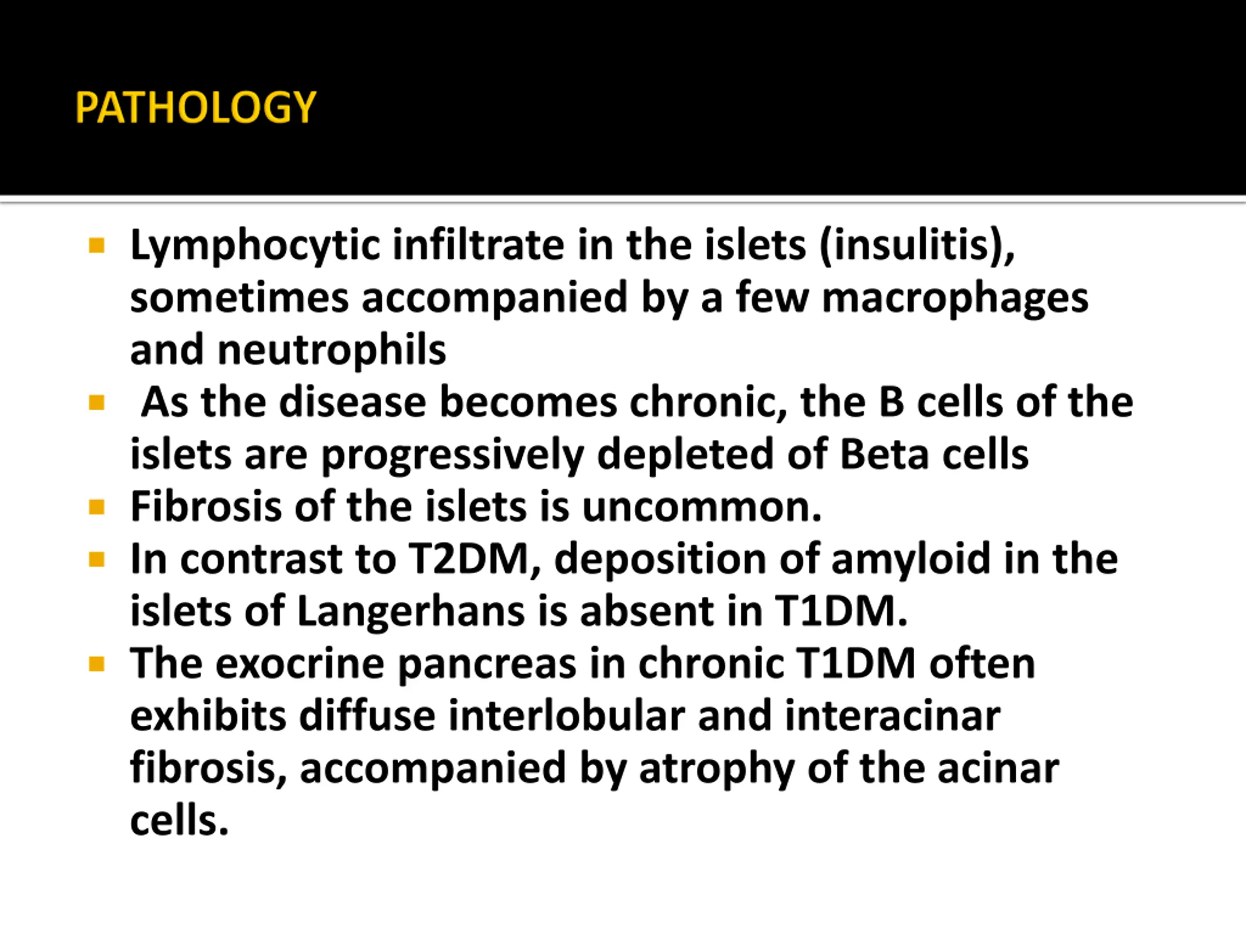 Lymphocytic infiltrate in the islets (insulitis), sometimes accompanied by a few macrophages and neutrophils As the disease becomes chronic, the B cells of the islets are progressively depleted of Beta cells Fibrosis of the islets is uncommon. In contrast to T2DM, deposition of amyloid in the islets of Langerhans is absent in T1DM. The exocrine pancreas in chronic T1DM often exhibits diffuse interlobular and interacinar fibrosis, accompanied by atrophy of the acinar cells.