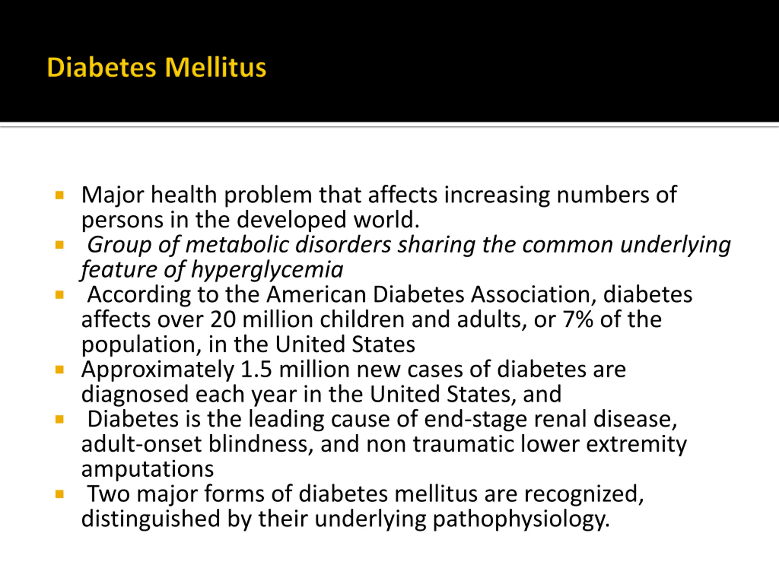 Major health problem that affects increasing numbers of persons in the developed world. Group of metabolic disorders sharing the common underlying feature of hyperglycemia According to the American Diabetes Association, diabetes affects over 20 million children and adults, or 7% of the population, in the United States Approximately 1.5 million new cases of diabetes are diagnosed each year in the United States, and Diabetes is the leading cause of end-stage renal disease, adult-onset blindness, and non traumatic lower extremity amputations Two major forms of diabetes mellitus are recognized, distinguished by their underlying pathophysiology.