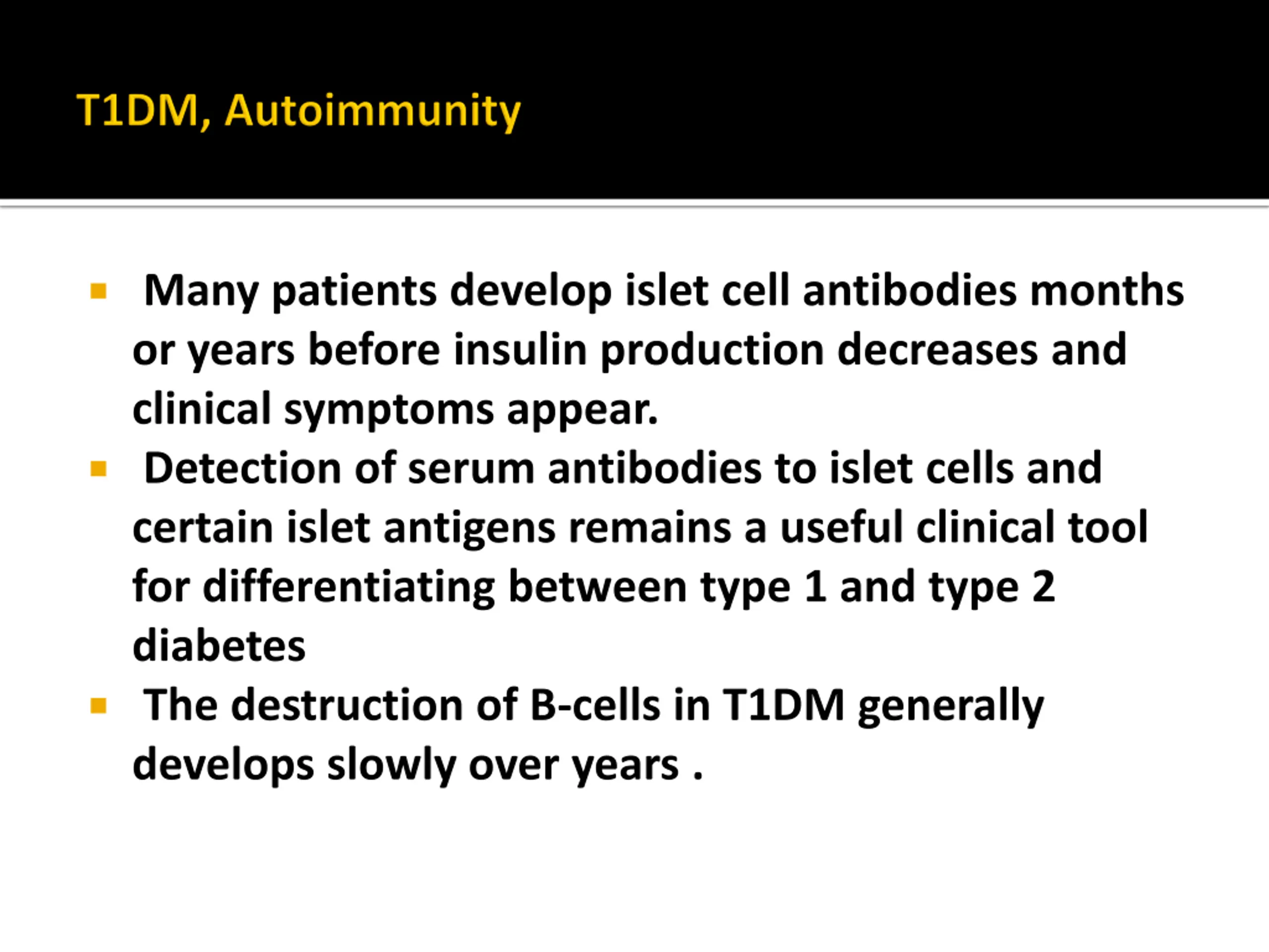 Many patients develop islet cell antibodies months or years before insulin production decreases and clinical symptoms appear. Detection of serum antibodies to islet cells and certain islet antigens remains a useful clinical tool for differentiating between type 1 and type 2 diabetes The destruction of B-cells in T1DM generally develops slowly over years .