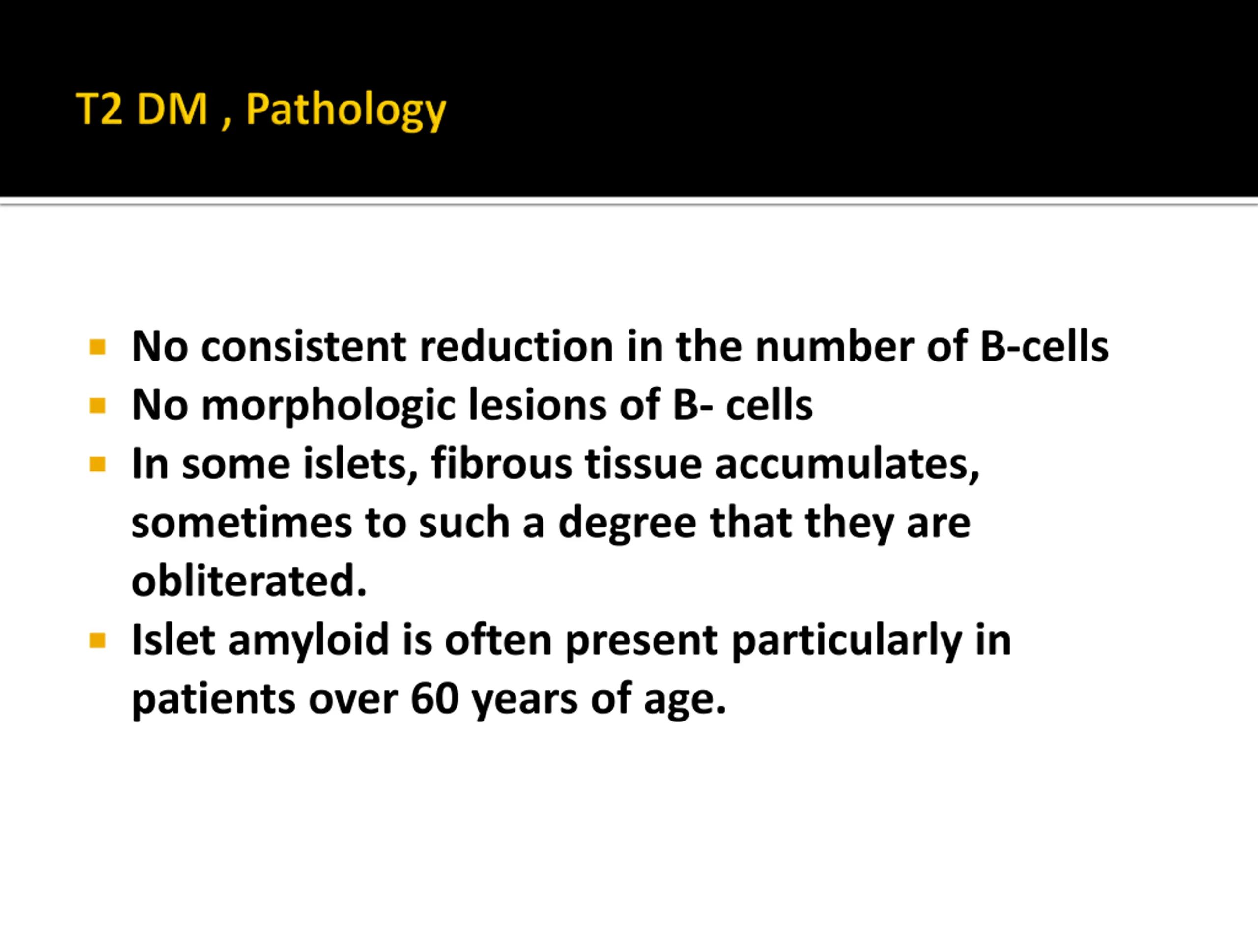 No consistent reduction in the number of B-cells No morphologic lesions of B- cells In some islets, fibrous tissue accumulates, sometimes to such a degree that they are obliterated. Islet amyloid is often present particularly in patients over 60 years of age.
