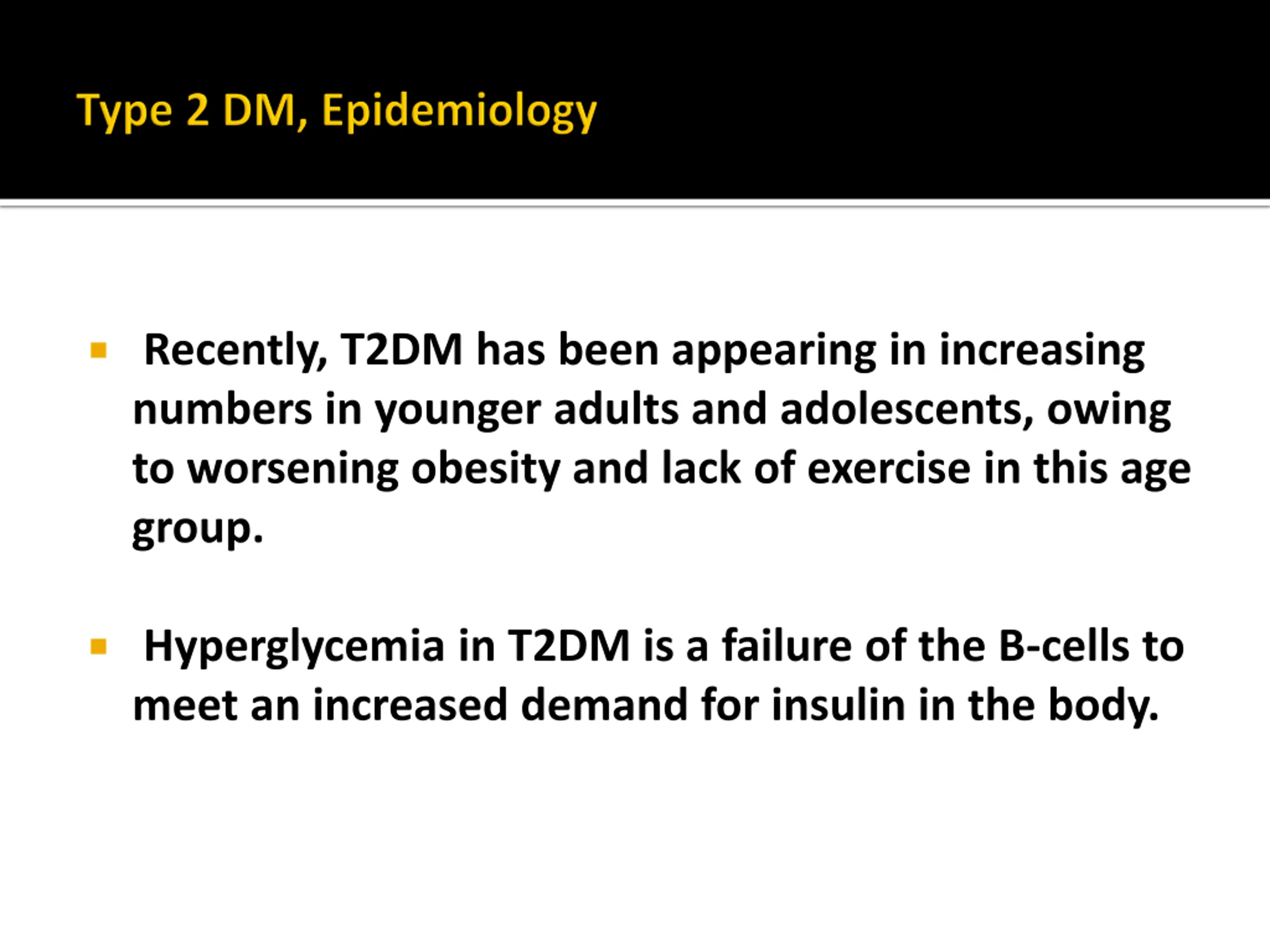 Recently, T2DM has been appearing in increasing numbers in younger adults and adolescents, owing to worsening obesity and lack of exercise in this age group. Hyperglycemia in T2DM is a failure of the B-cells to meet an increased demand for insulin in the body.
