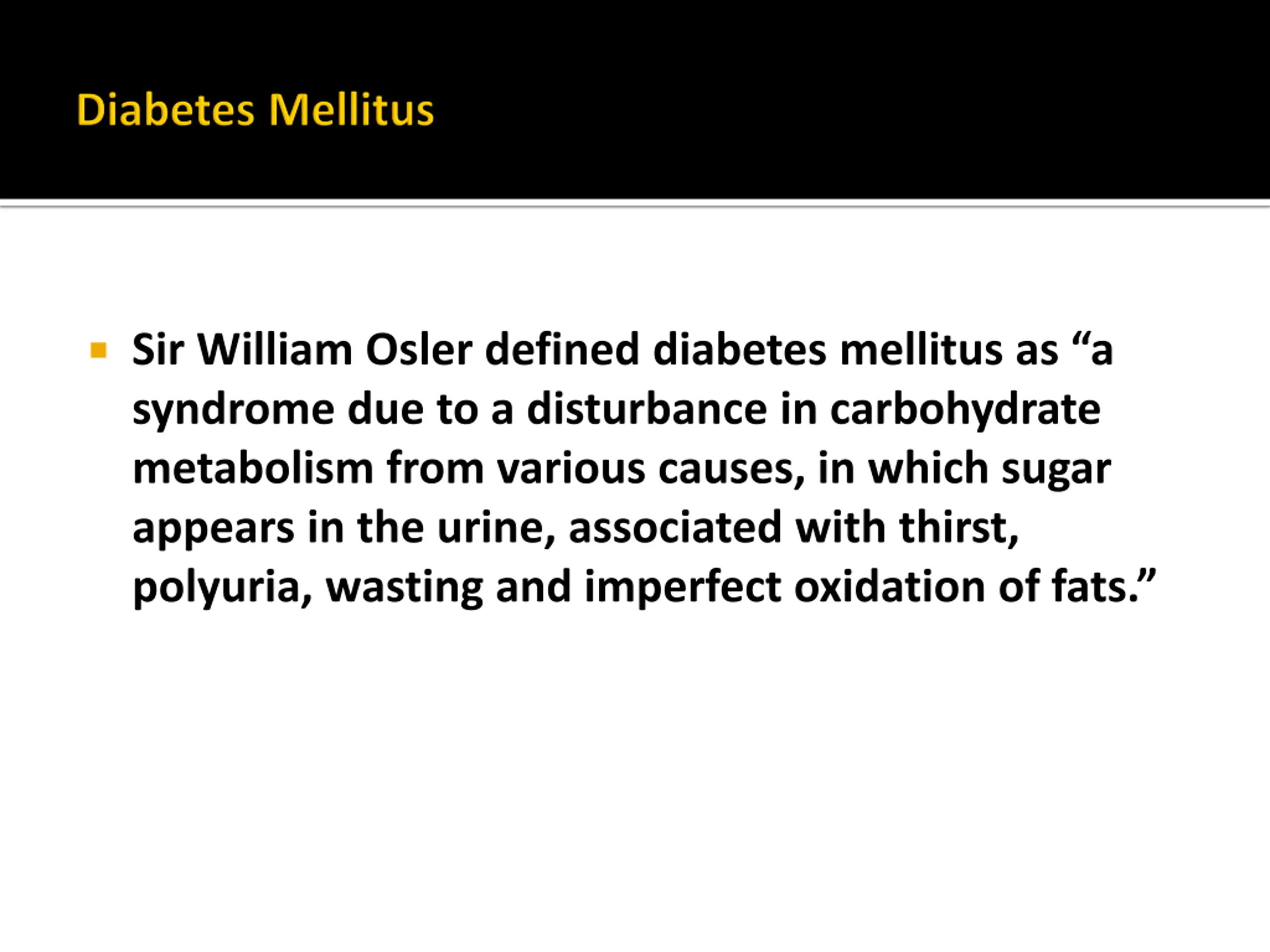 Sir William Osler defined diabetes mellitus as a syndrome due to a disturbance in carbohydrate metabolism from various causes, in which sugar appears in the urine, associated with thirst, polyuria, wasting and imperfect oxidation of fats.