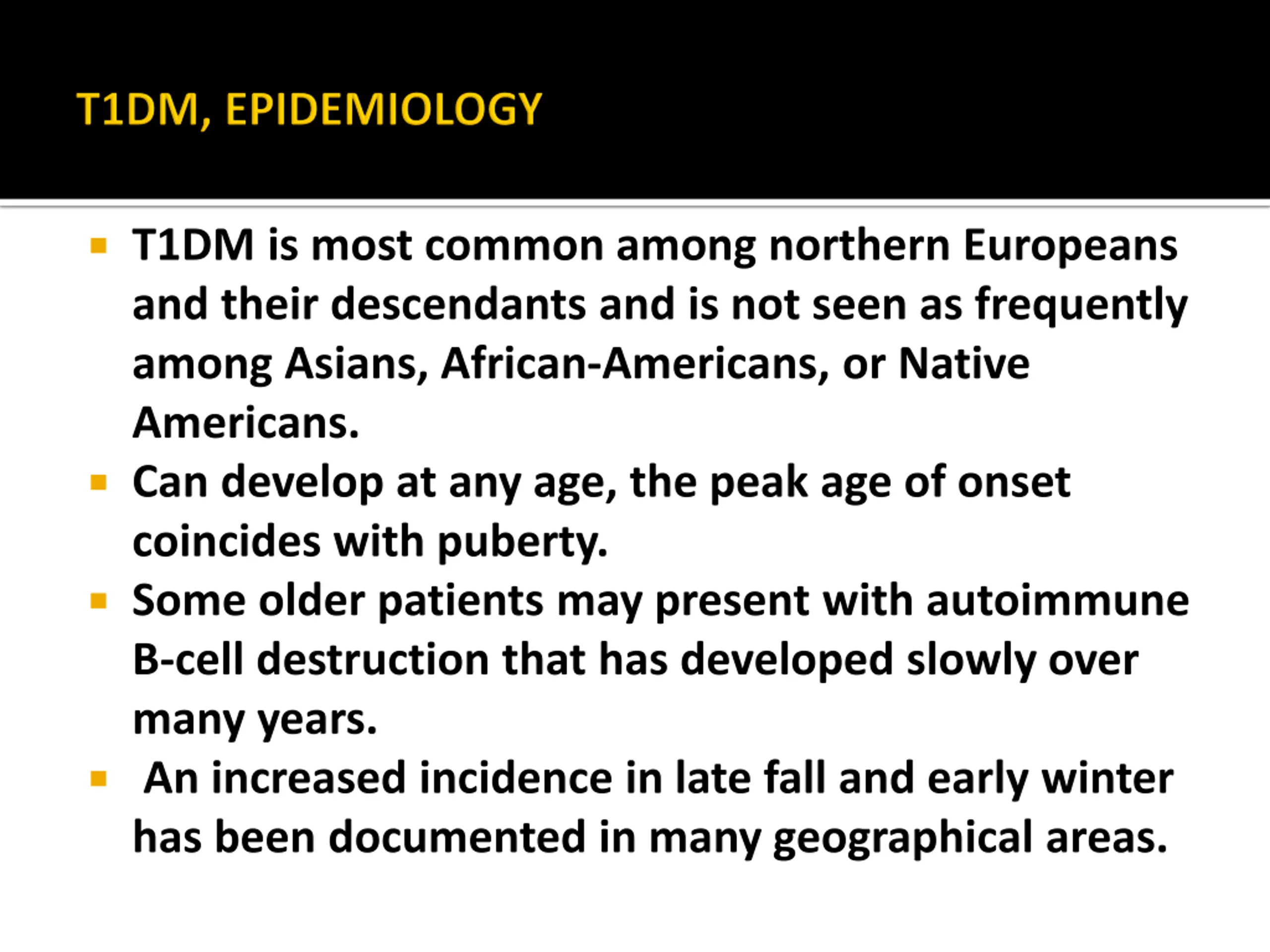 T1DM is most common among northern Europeans and their descendants and is not seen as frequently among Asians, African-Americans, or Native Americans. Can develop at any age, the peak age of onset coincides with puberty. Some older patients may present with autoimmune B-cell destruction that has developed slowly over many years. An increased incidence in late fall and early winter has been documented in many geographical areas.