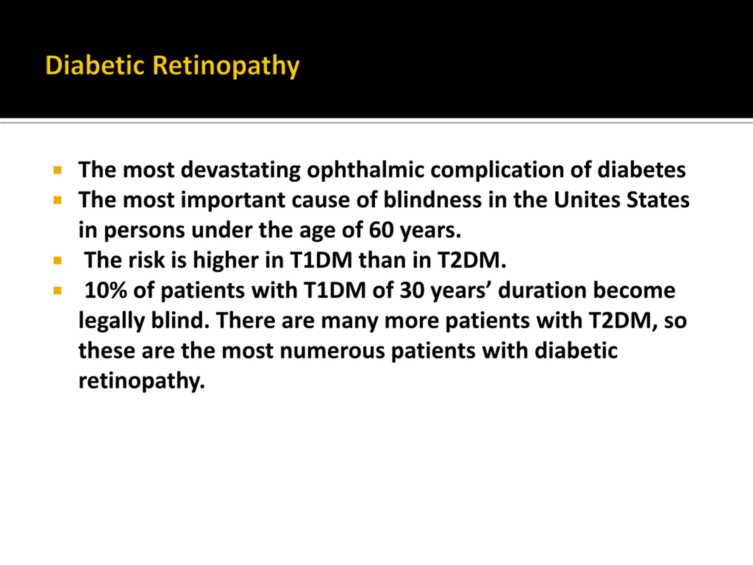 The most devastating ophthalmic complication of diabetes The most important cause of blindness in the Unites States in persons under the age of 60 years. The risk is higher in T1DM than in T2DM. 10% of patients with T1DM of 30 years duration become legally blind. There are many more patients with T2DM, so these are the most numerous patients with diabetic retinopathy.