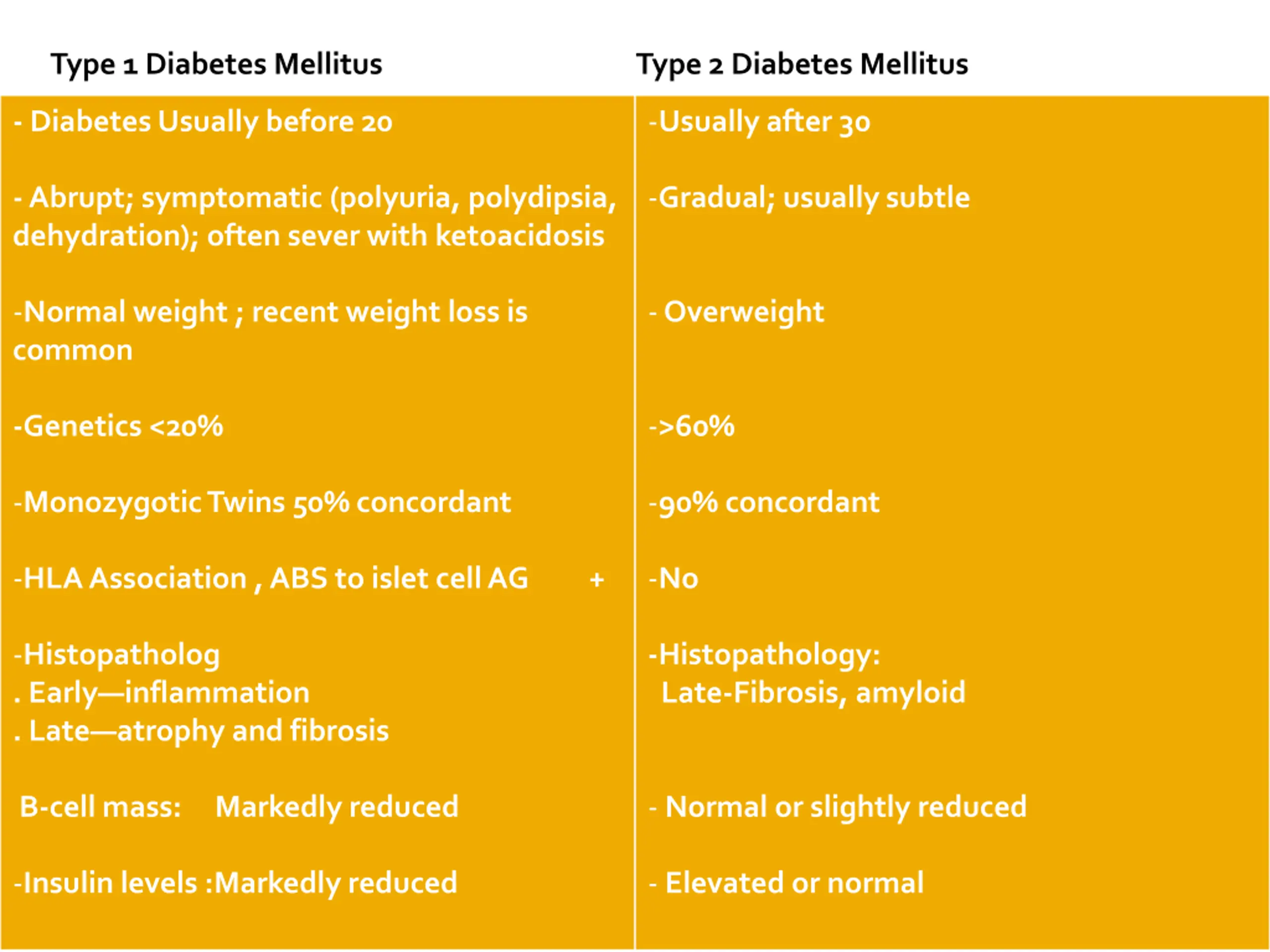 Type 1 Diabetes Mellitus Type 2 Diabetes Mellitus - Diabetes Usually before 20 -Usually after 30 - Abrupt; symptomatic (polyuria, polydipsia, dehydration); often sever with ketoacidosis -Gradual; usually subtle -Normal weight ; recent weight loss is common - Overweight -Genetics <20% ->60% -Monozygotic Twins 50% concordant -90% concordant -HLA Association , ABS to islet cell AG + -No -Histopatholog . Early inflammation . Late atrophy and fibrosis -Histopathology: Late-Fibrosis, amyloid B-cell mass: Markedly reduced - Normal or slightly reduced -Insulin levels :Markedly reduced - Elevated or normal