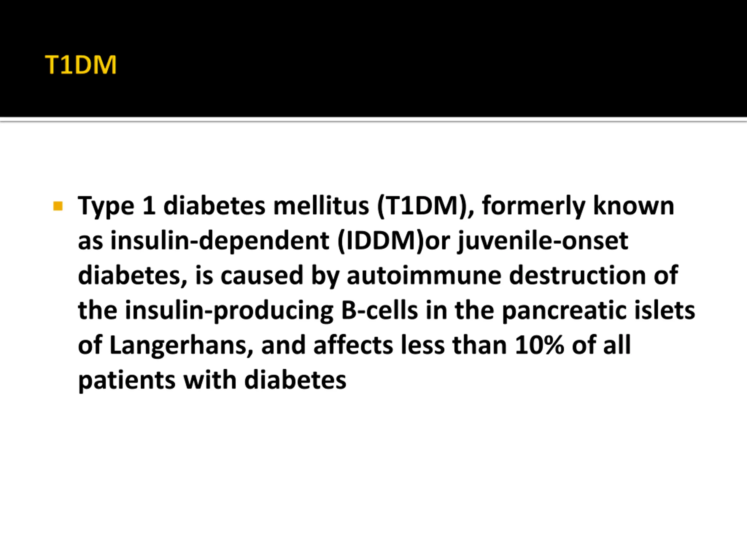 Type 1 diabetes mellitus (T1DM), formerly known as insulin-dependent (IDDM)or juvenile-onset diabetes, is caused by autoimmune destruction of the insulin-producing B-cells in the pancreatic islets of Langerhans, and affects less than 10% of all patients with diabetes