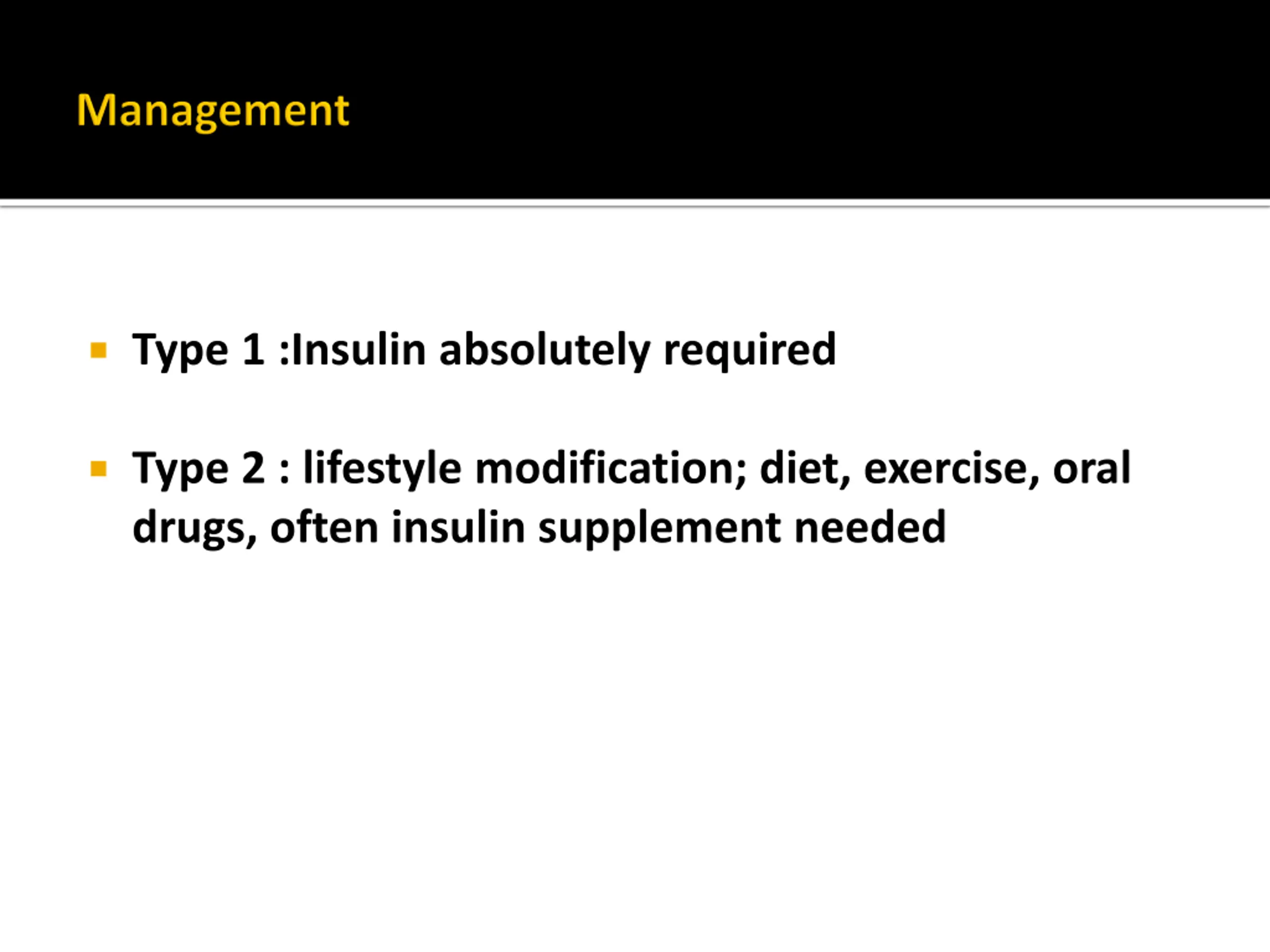 Type 1 :Insulin absolutely required Type 2 : lifestyle modification; diet, exercise, oral drugs, often insulin supplement needed
