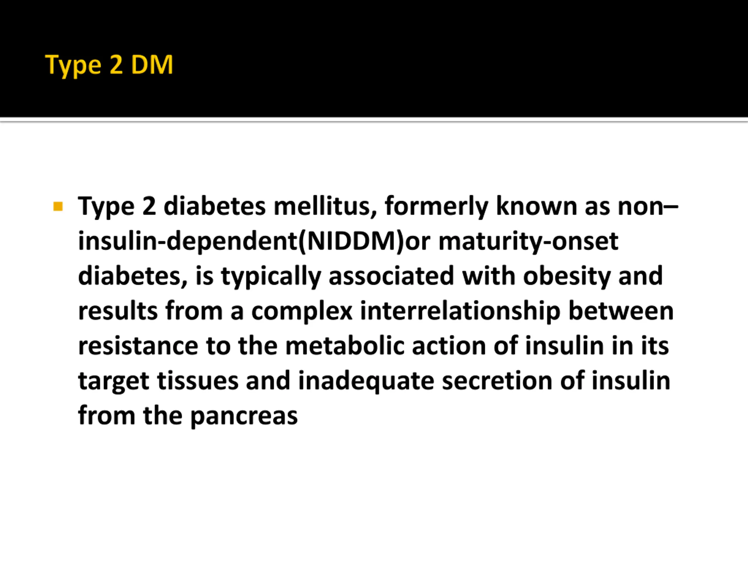 Type 2 diabetes mellitus, formerly known as non insulin-dependent(NIDDM)or maturity-onset diabetes, is typically associated with obesity and results from a complex interrelationship between resistance to the metabolic action of insulin in its target tissues and inadequate secretion of insulin from the pancreas