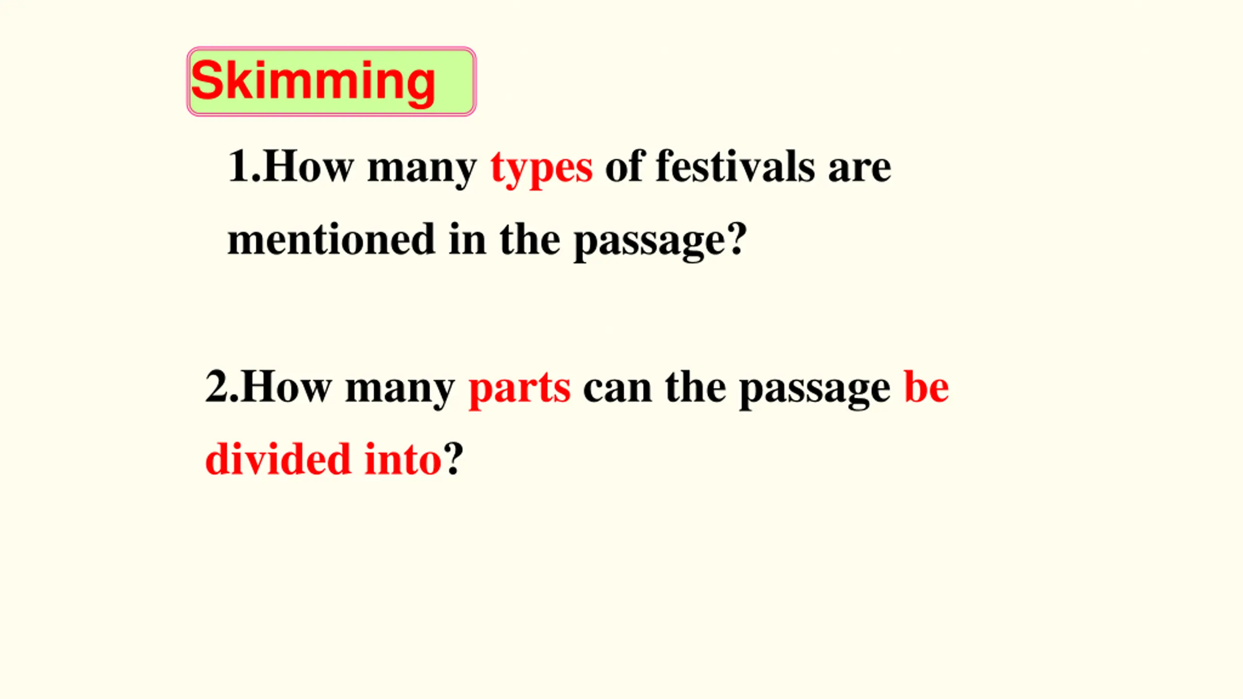Skimming 1.How many types of festivals are mentioned in the passage? 2.How many parts can the passage be divided into?