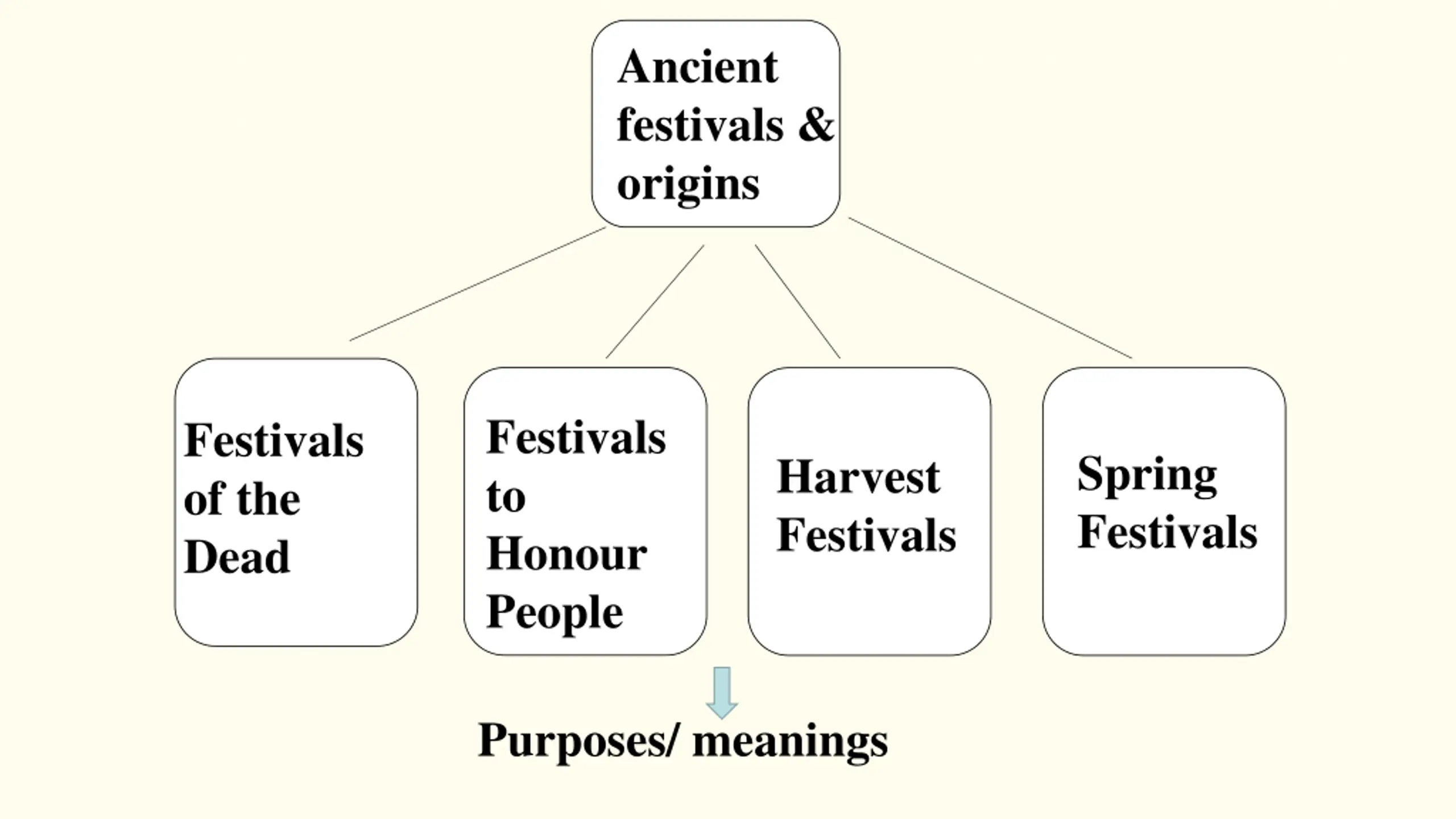 Ancient festivals & origins Festivals to Honour People Festivals of the Dead Spring Festivals Harvest Festivals Purposes/ meanings