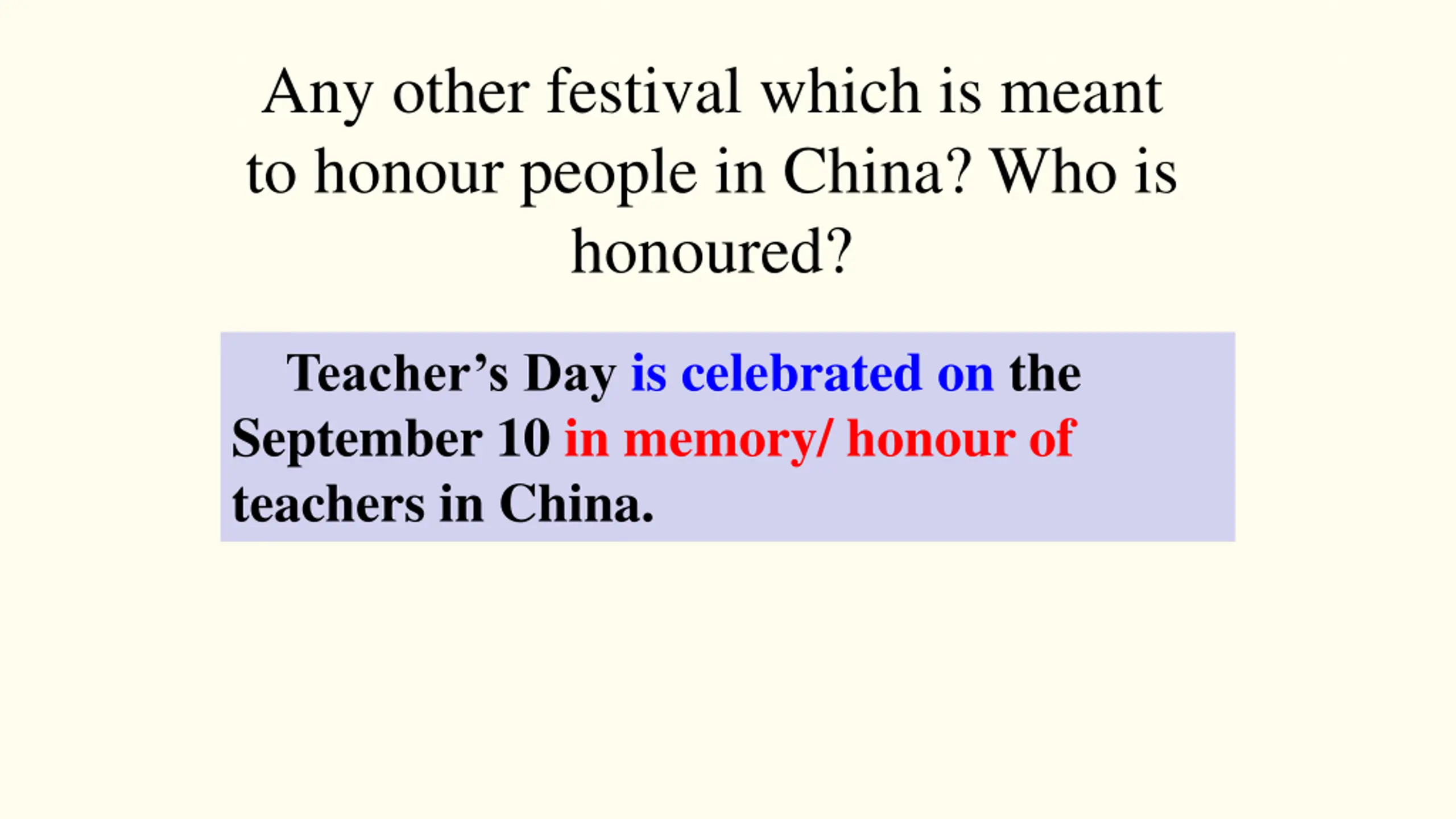 Any other festival which is meant to honour people in China? Who is honoured? Teacher s Day is celebrated on the September 10 in memory/ honour of teachers in China.