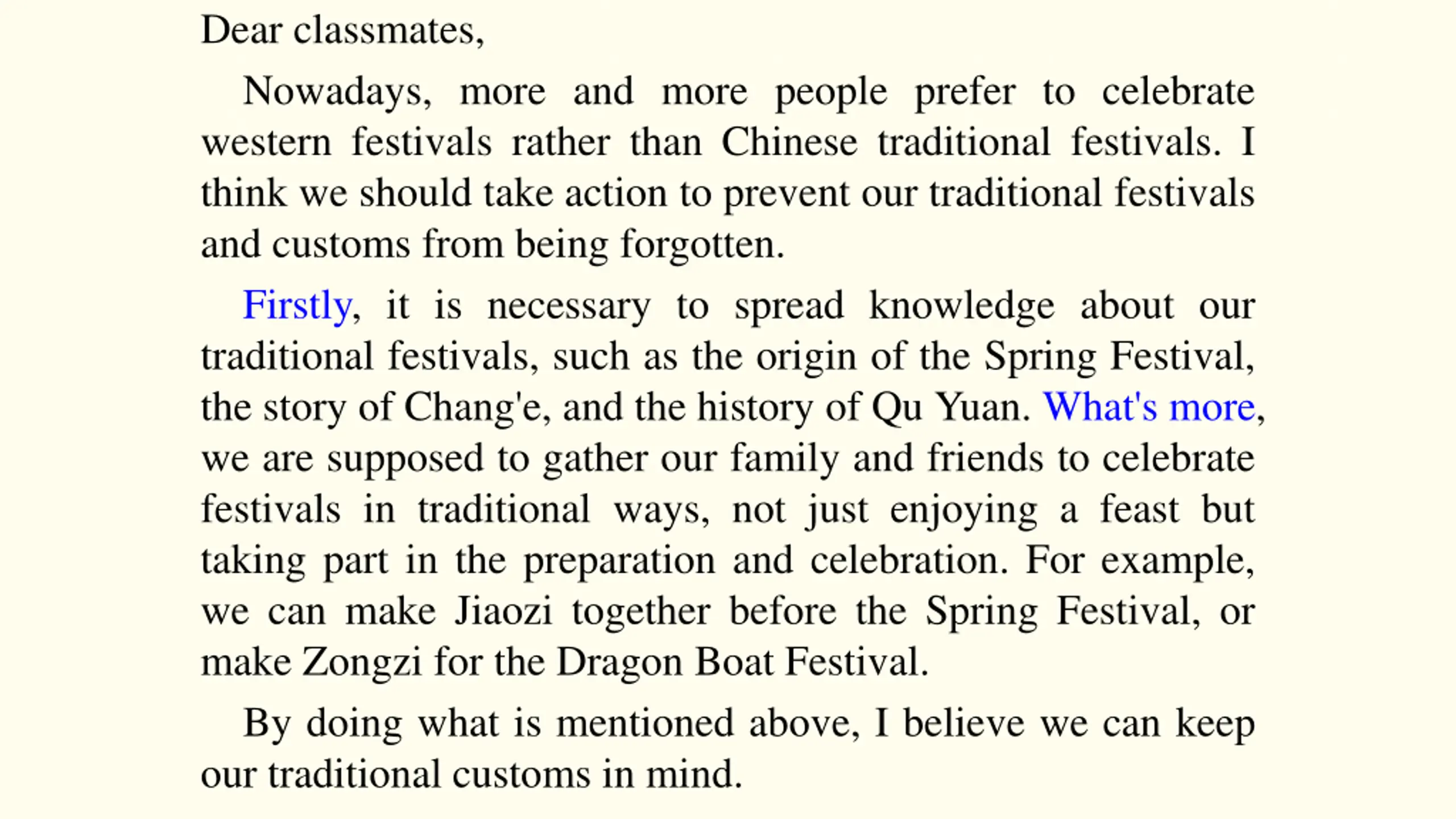 Dear classmates, Nowadays, more and more people prefer to celebrate western festivals rather than Chinese traditional festivals. I think we should take action to prevent our traditional festivals and customs from being forgotten. Firstly, it is necessary to spread knowledge about our traditional festivals, such as the origin of the Spring Festival, the story of Chang'e, and the history of Qu Yuan. What's more, we are supposed to gather our family and friends to celebrate festivals in traditional ways, not just enjoying a feast but taking part in the preparation and celebration. For example, we can make Jiaozi together before the Spring Festival, or make Zongzi for the Dragon Boat Festival. By doing what is mentioned above, I believe we can keep our traditional customs in mind.