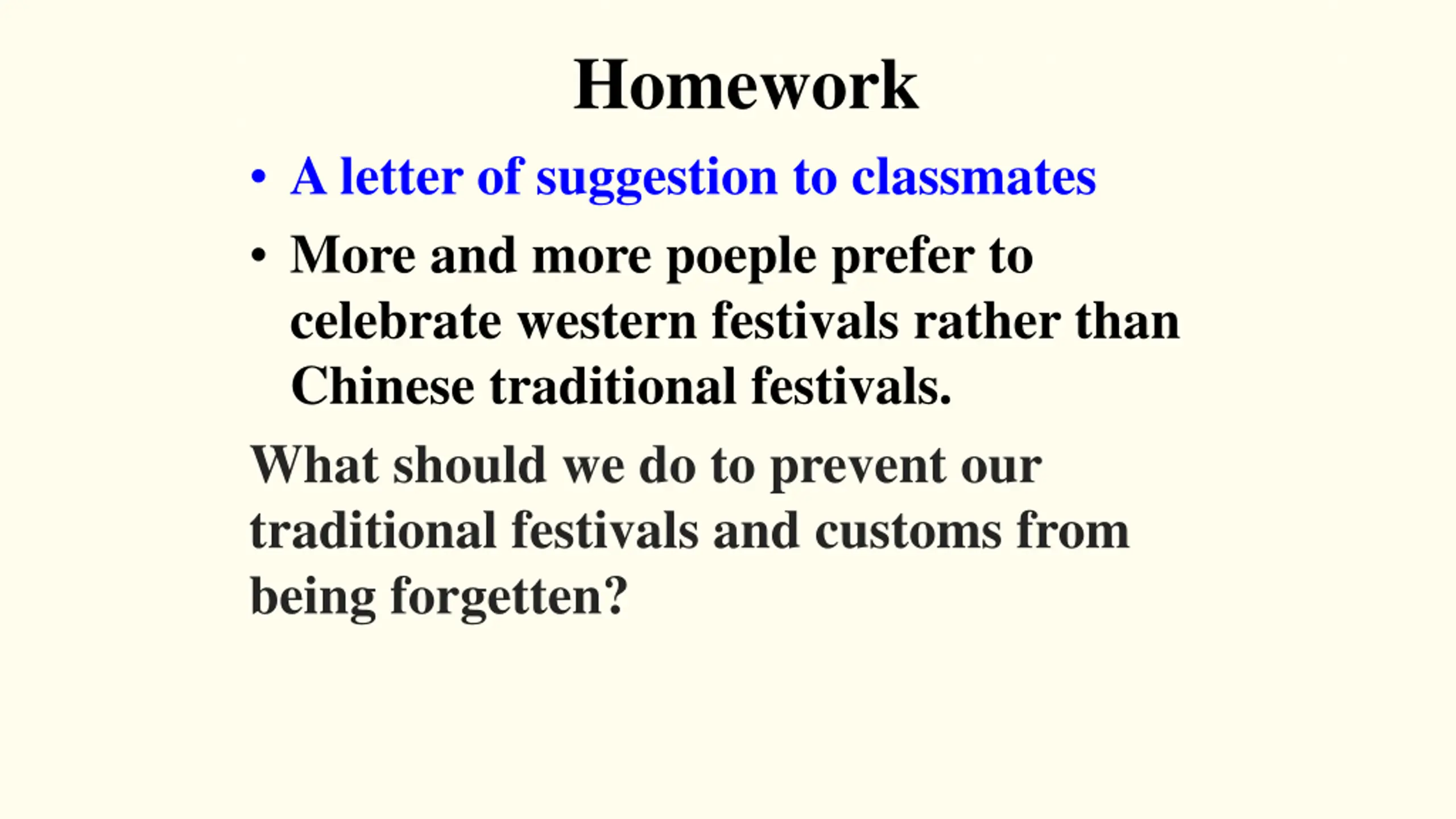Homework A letter of suggestion to classmates More and more poeple prefer to celebrate western festivals rather than Chinese traditional festivals. What should we do to prevent our traditional festivals and customs from being forgetten?