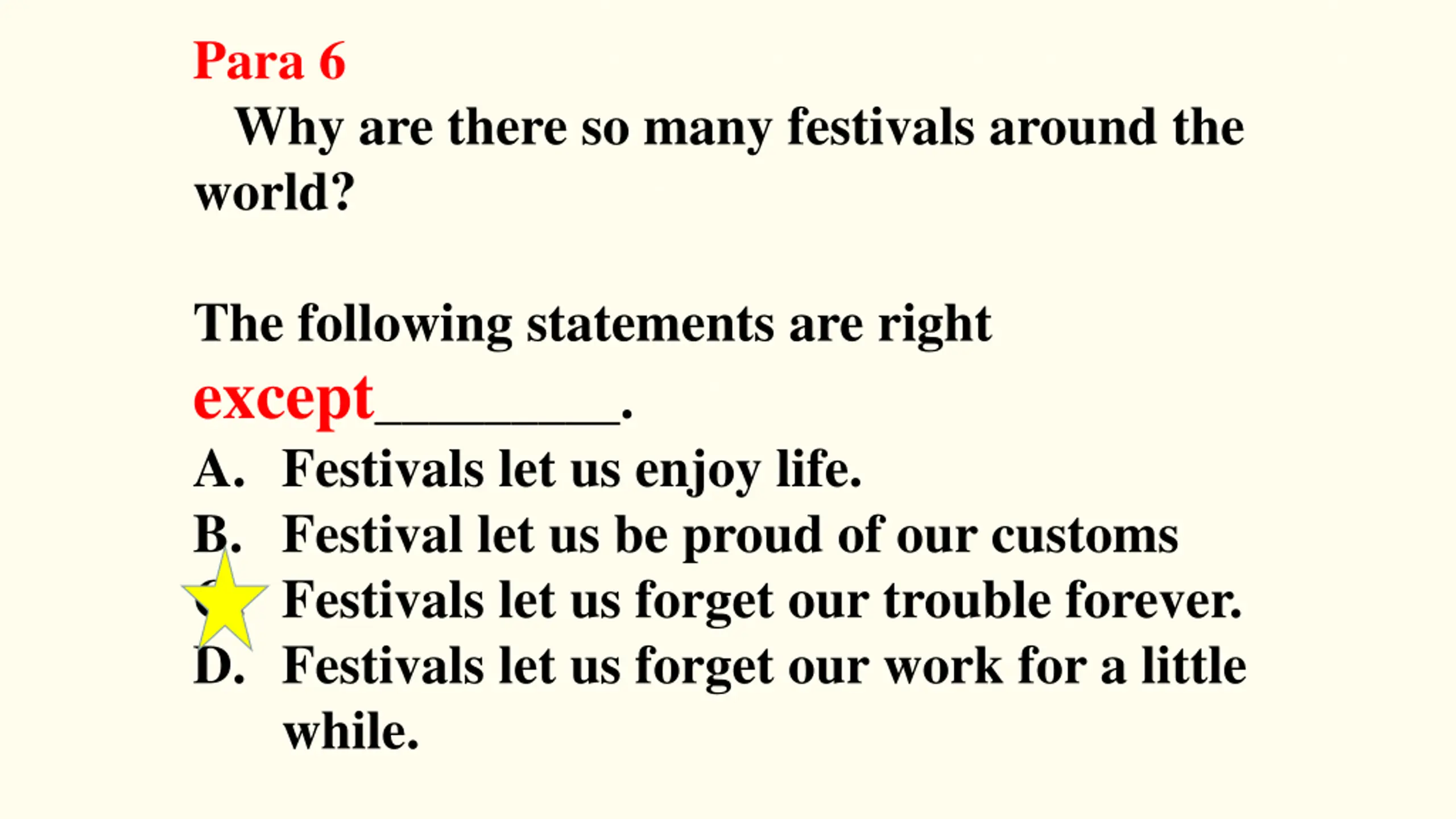 Para 6 Why are there so many festivals around the world? The following statements are right except_________. A. Festivals let us enjoy life. B. Festival let us be proud of our customs C. Festivals let us forget our trouble forever. D. Festivals let us forget our work for a little while.