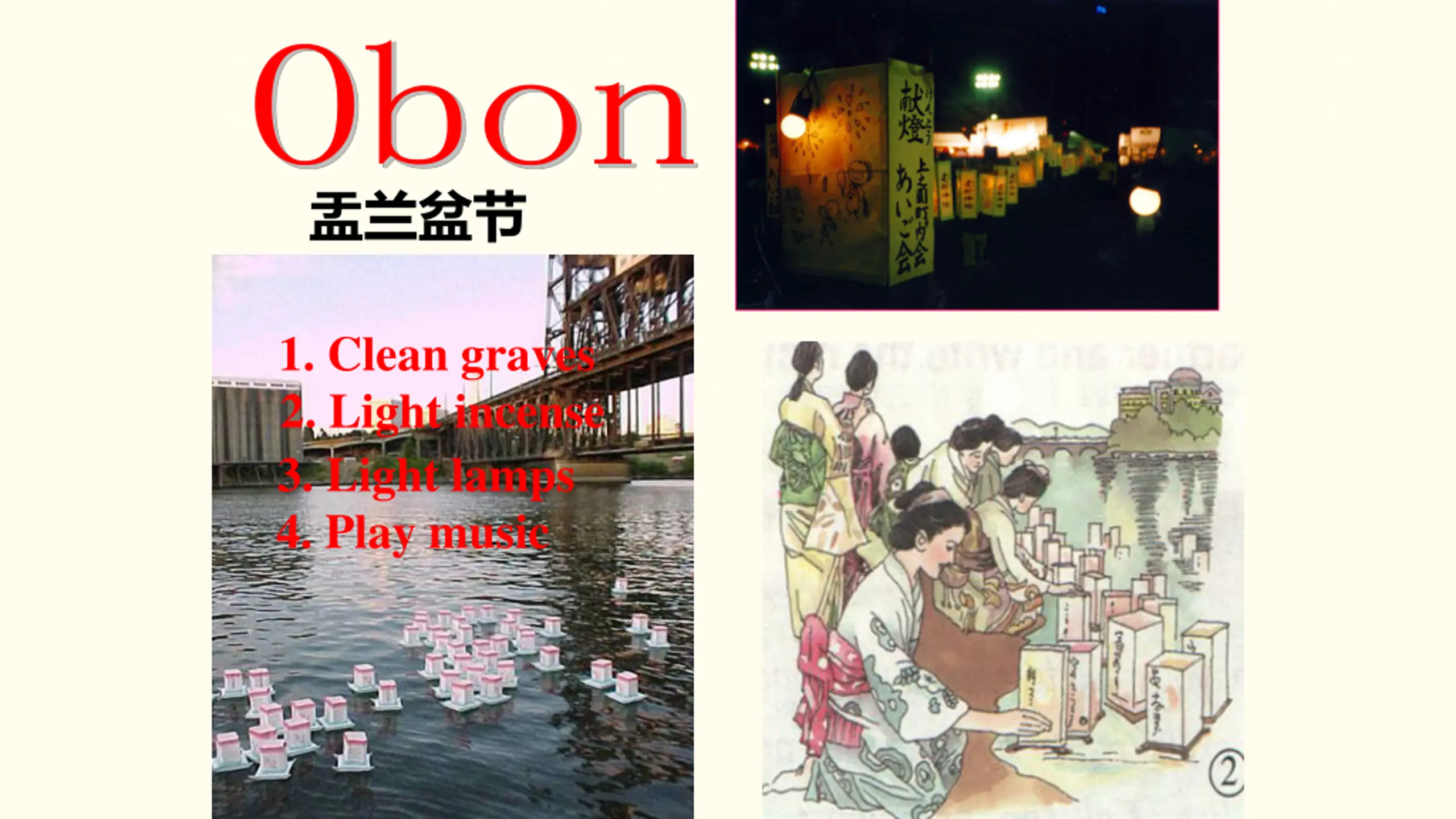 Obon 1. Clean graves 2. Light incense 3. Light lamps 4. Play music