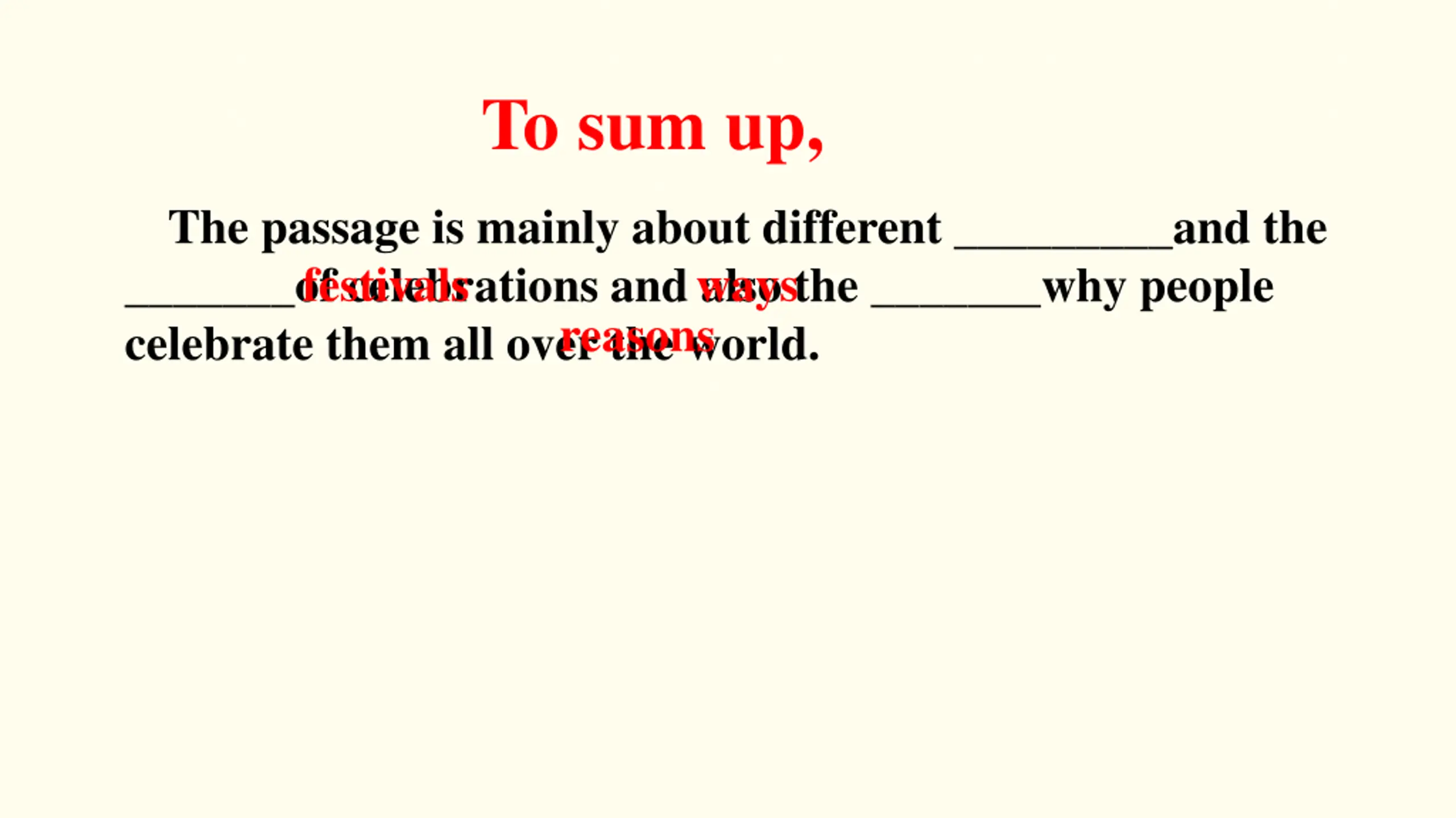 To sum up, The passage is mainly about different _________and the _______of celebrations and also the _______why people celebrate them all over the world. reasons festivals ways