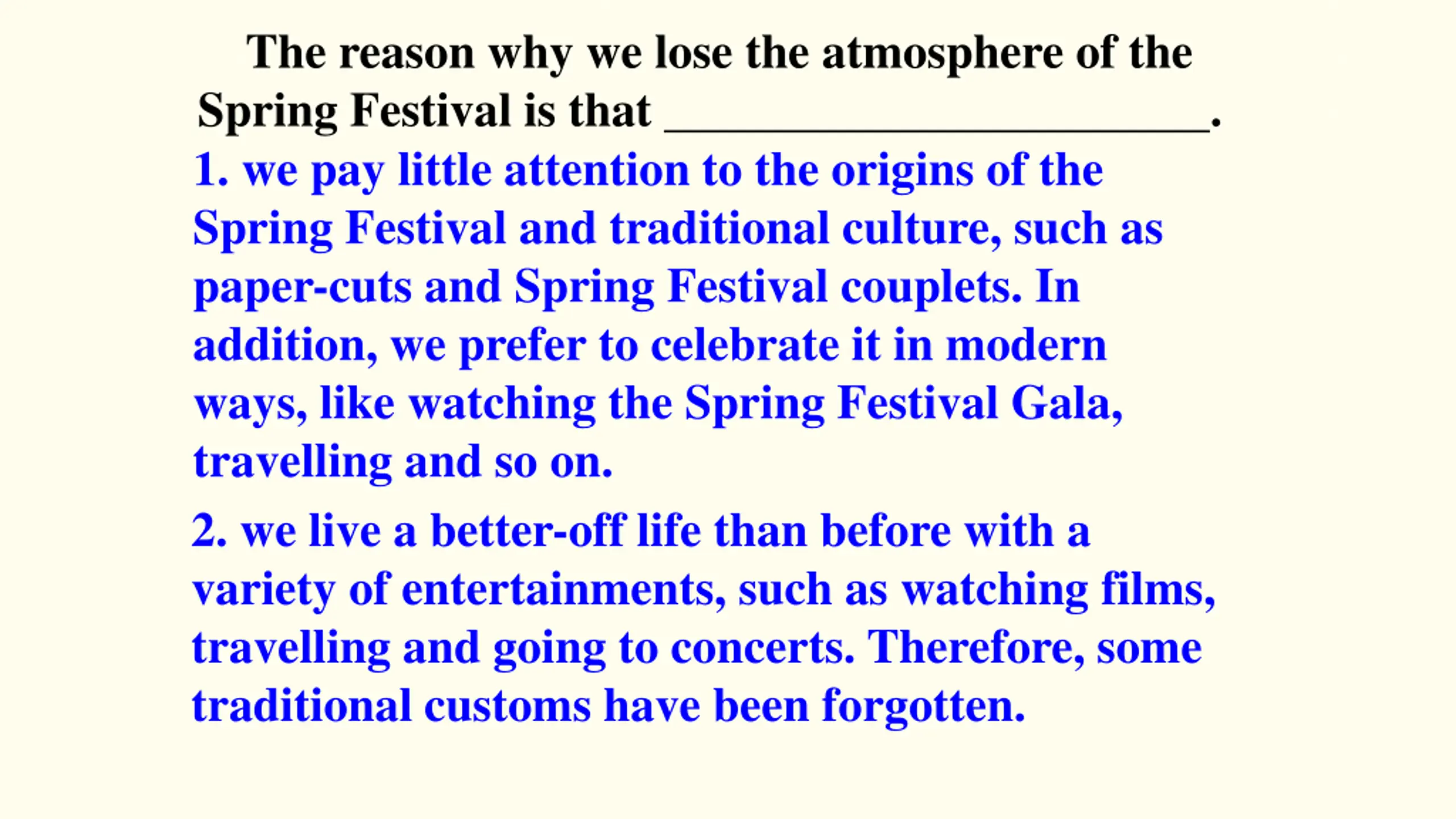The reason why we lose the atmosphere of the Spring Festival is that 1. we pay little attention to the origins of the Spring Festival and traditional culture, such as paper-cuts and Spring Festival couplets. In addition, we prefer to celebrate it in modern ways, like watching the Spring Festival Gala, travelling and so on. 2. we live a better-off life than before with a variety of entertainments, such as watching films, travelling and going to concerts. Therefore, some traditional customs have been forgotten. .