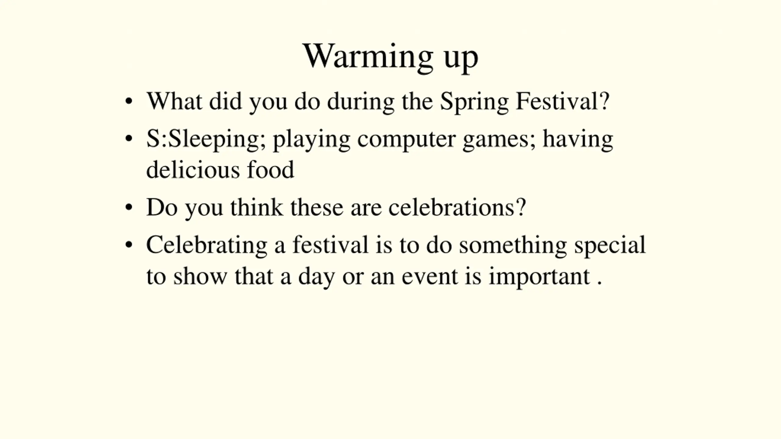 Warming up What did you do during the Spring Festival? S:Sleeping; playing computer games; having delicious food Do you think these are celebrations? Celebrating a festival is to do something special to show that a day or an event is important .