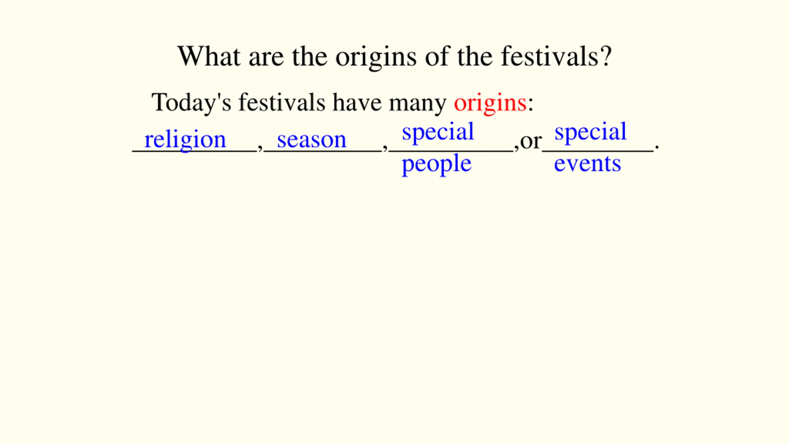 What are the origins of the festivals? Today's festivals have many origins: , religion season special people special events , ,or .