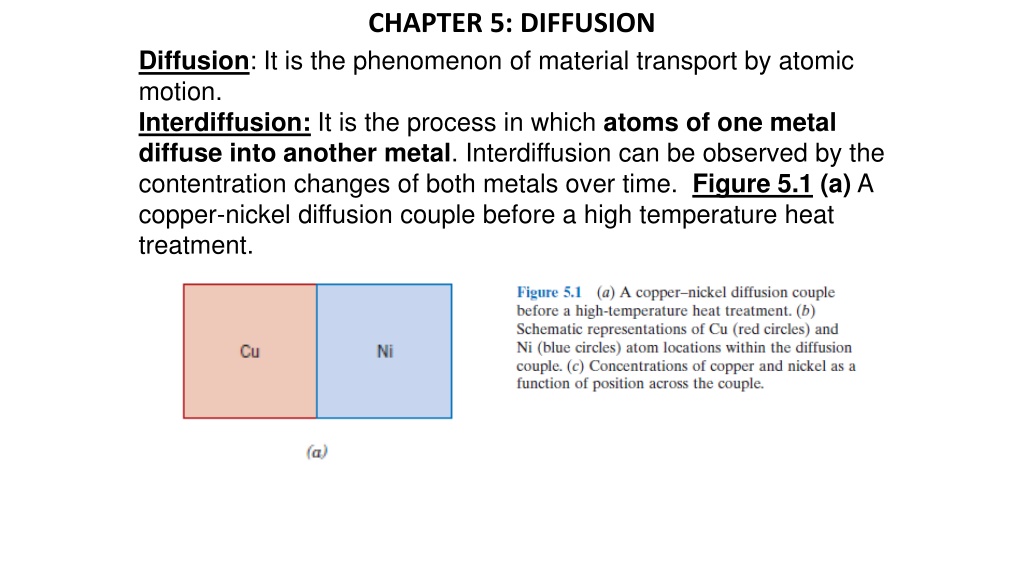 CHAPTER 5: DIFFUSION Diffusion: It is the phenomenon of material transport by atomic motion. Interdiffusion: It is the process in which atoms of one metal diffuse into another metal. Interdiffusion can be observed by the contentration changes of both metals over time. Figure 5.1 (a) A copper-nickel diffusion couple before a high temperature heat treatment.