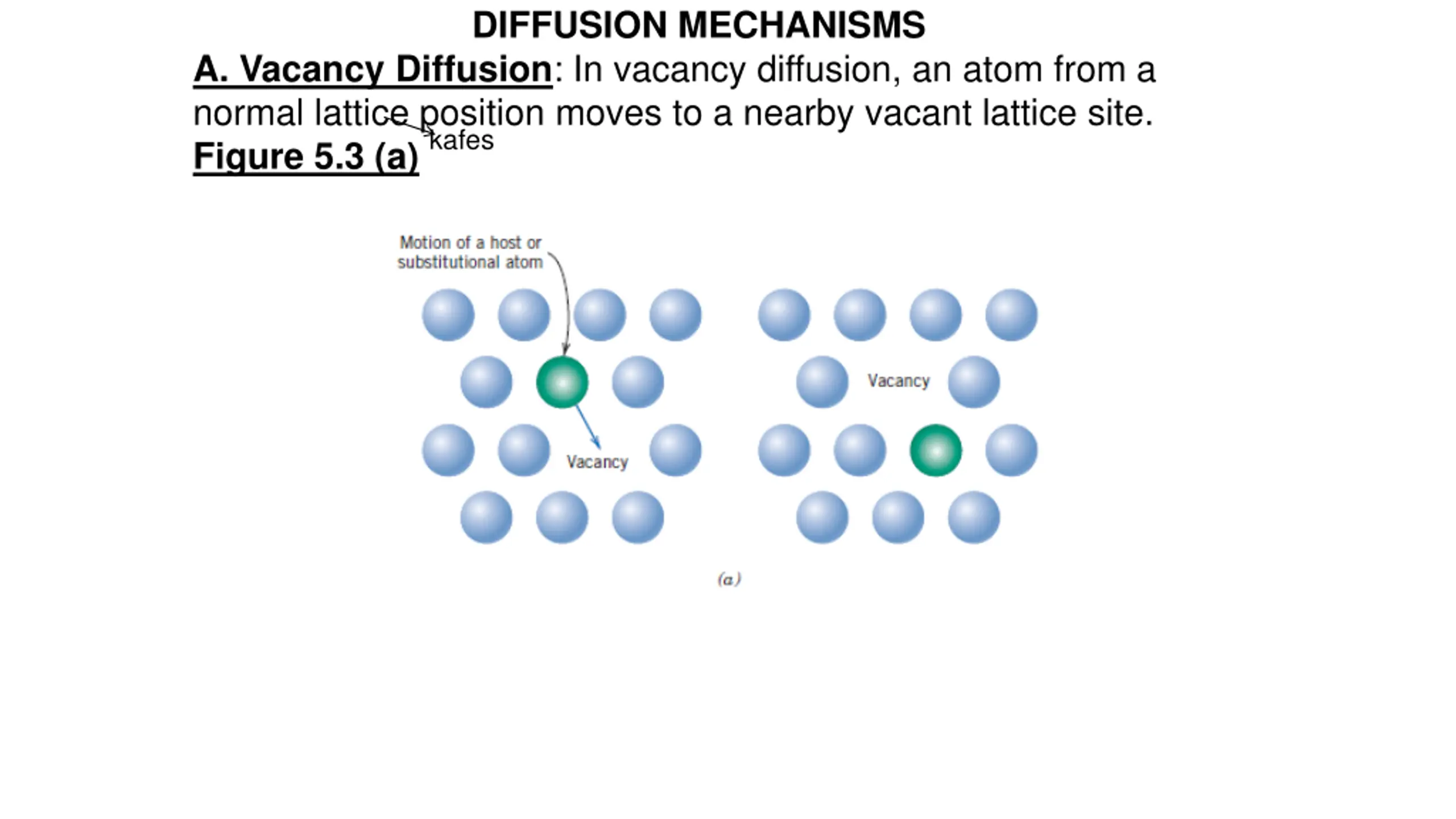 DIFFUSION MECHANISMS A. Vacancy Diffusion: In vacancy diffusion, an atom from a normal lattice position moves to a nearby vacant lattice site. Figure 5.3 (a)kafes