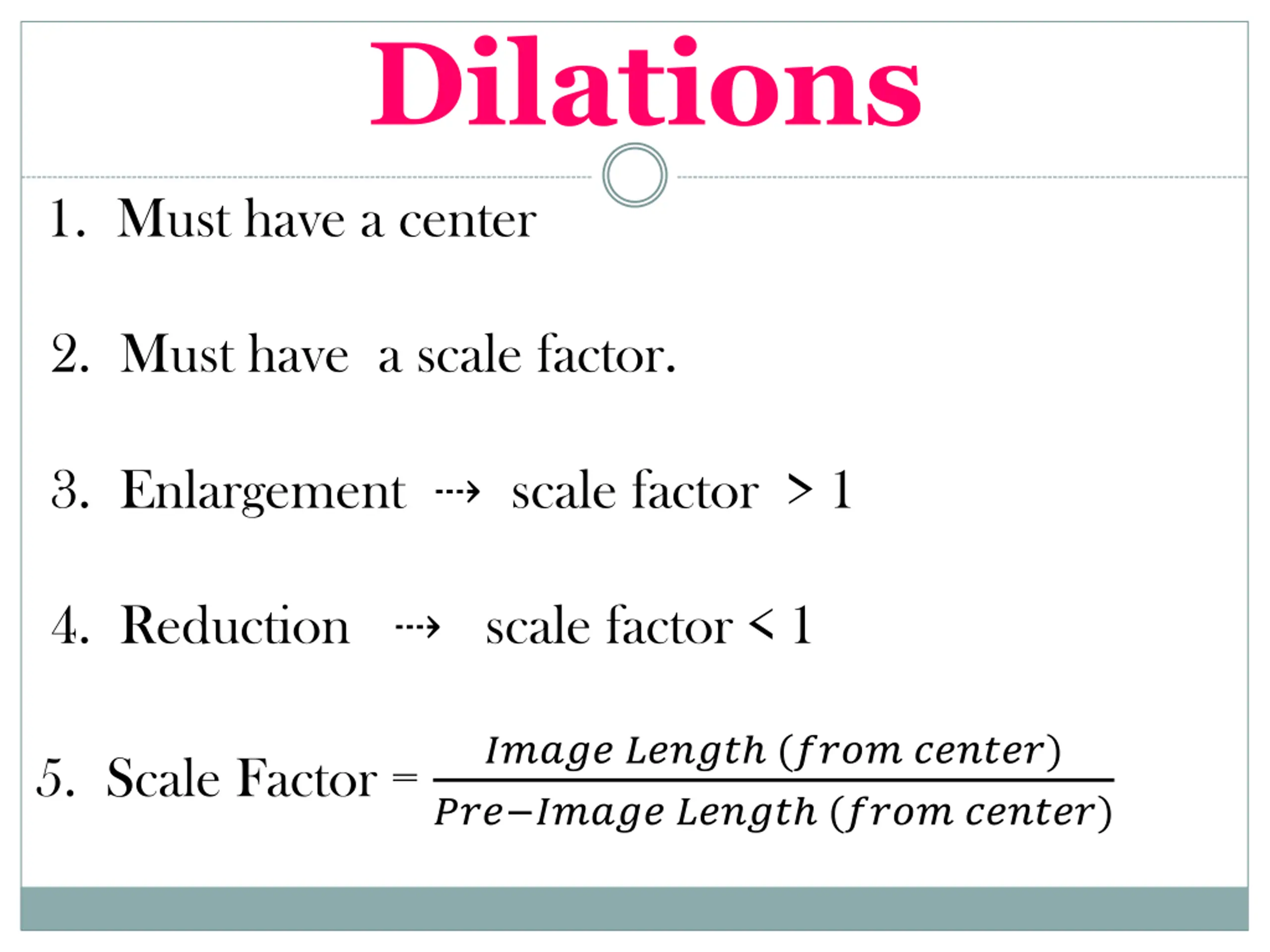 Dilations 1. Must have a center 2. Must have a scale factor. 3. Enlargement scale factor > 1 4. Reduction scale factor < 1 ????? ????? (???? ??????) ??? ????? ????? (???? ??????) 5. Scale Factor =