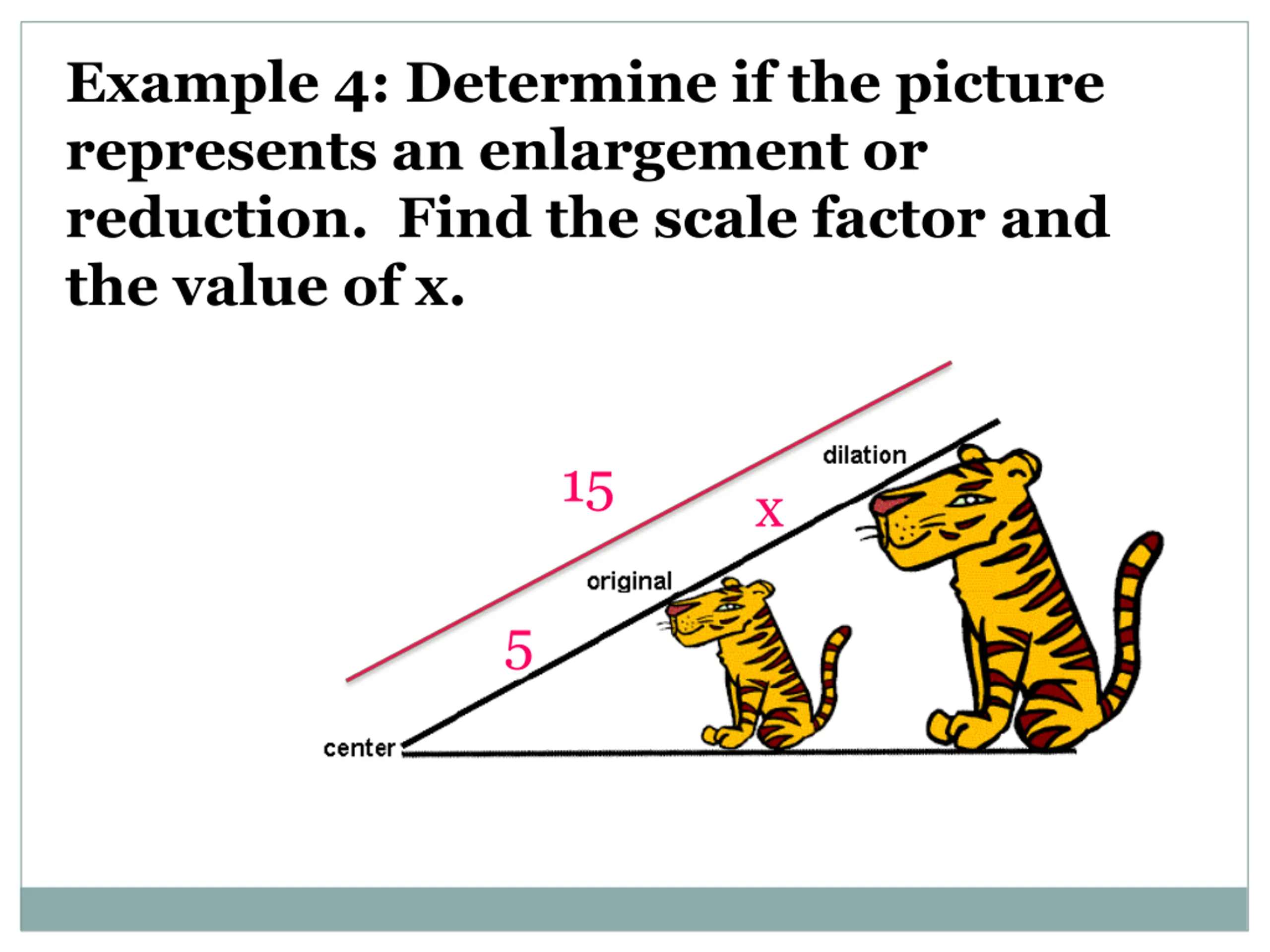 Example 4: Determine if the picture represents an enlargement or reduction. Find the scale factor and the value of x. 15 x 5
