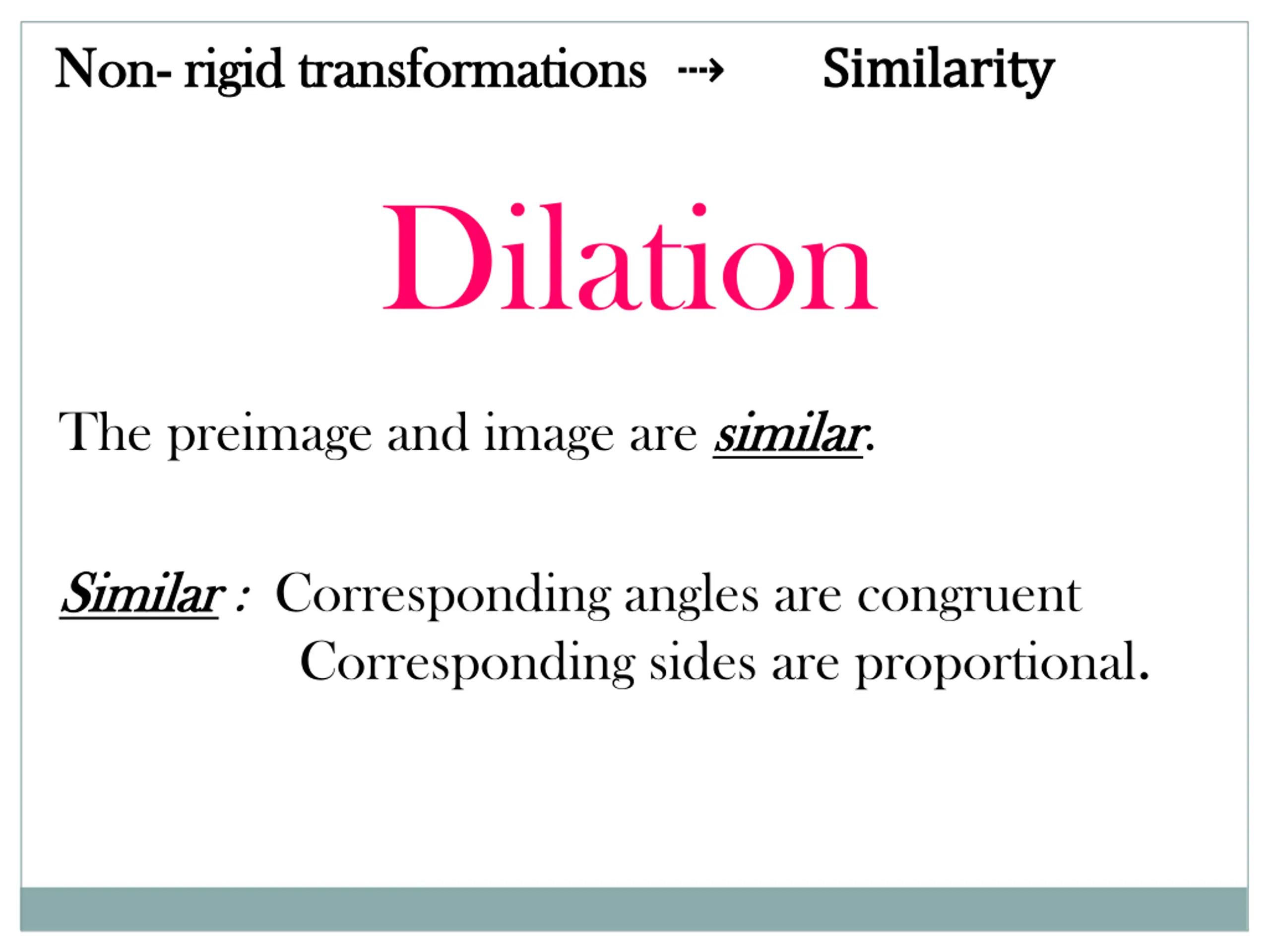 Non Non- - rigid transformations rigid transformations Similarity Similarity Dilation The preimage and image are similar similar. Similar Similar : Corresponding angles are congruent Corresponding sides are proportional.