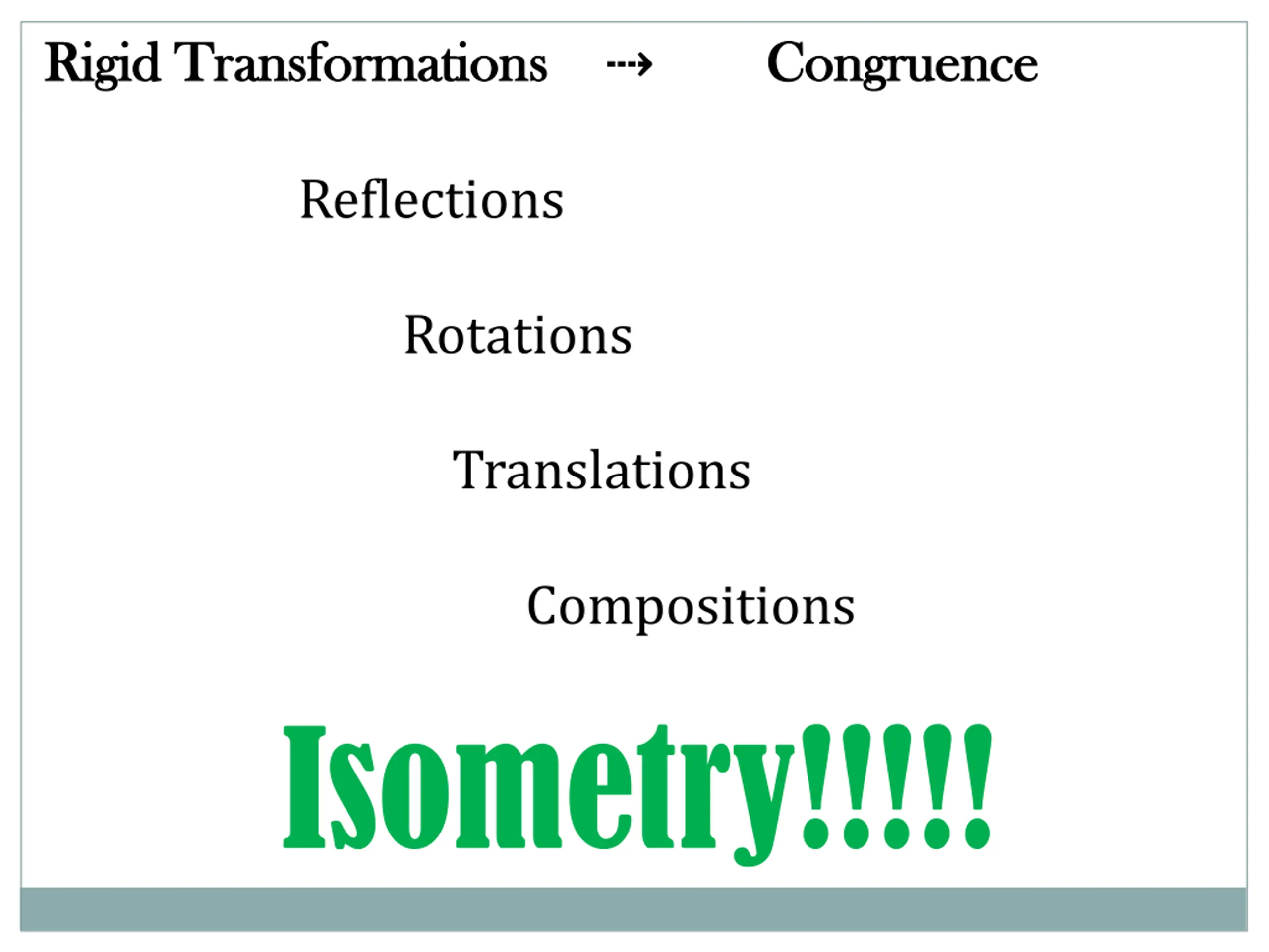 Rigid Transformations Rigid Transformations Congruence Congruence Reflections Rotations Translations Compositions Isometry!!!!!